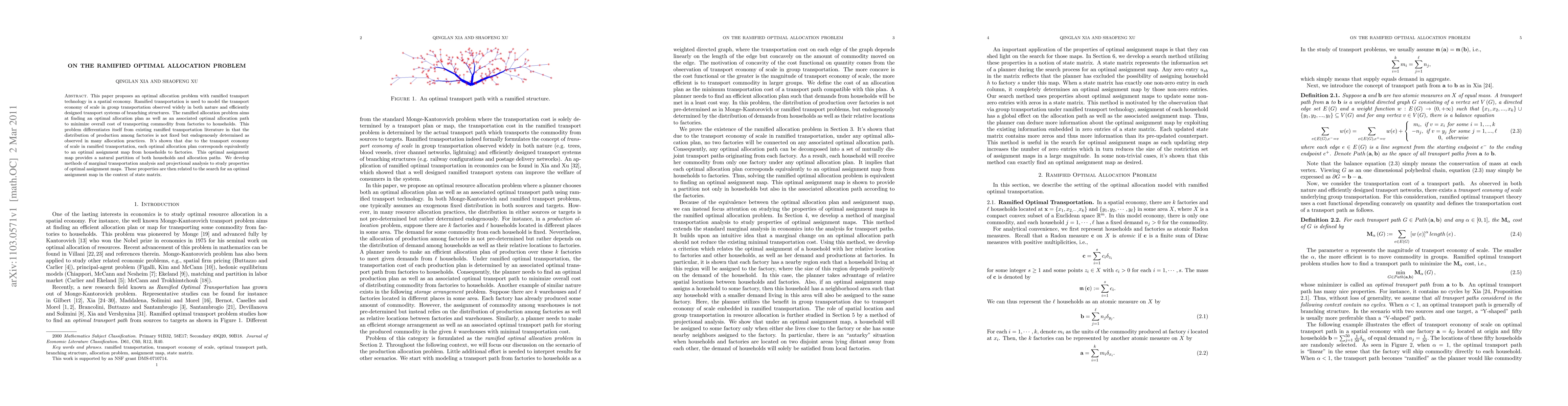 This paper proposes an optimal allocation problem with ramified transport technology in a spatial economy. Ramified transportation is used to model the transport economy of scale in group transportation observed widely in both nature and efficiently designed transport systems of branching structures. The ramified allocation problem aims at finding an optimal allocation plan as well as an associated optimal allocation path to minimize overall cost of transporting commodity from factories to households. This problem differentiates itself from existing ramified transportation literature in that the distribution of production among factories is not fixed but endogenously determined as observed in many allocation practices. It's shown that due to the transport economy of scale in ramified transportation, each optimal allocation plan corresponds equivalently to an optimal assignment map from households to factories. This optimal assignment map provides a natural partition of both households and allocation paths. We develop methods of marginal transportation analysis and projectional analysis to study properties of optimal assignment maps. These properties are then related to the search for an optimal assignment map in the context of state matrix.