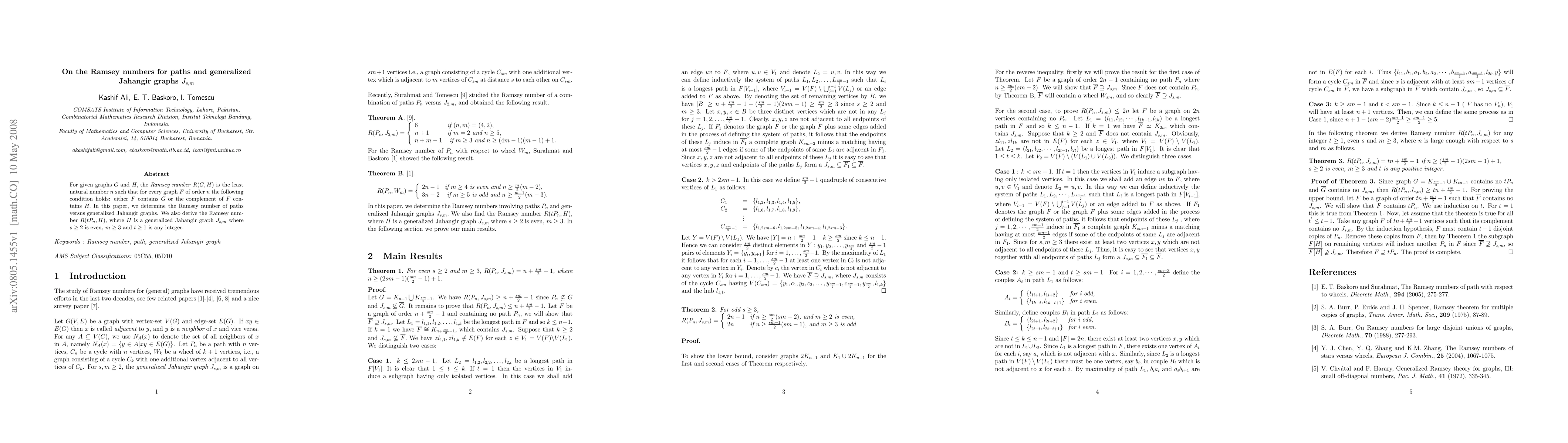 For given graphs $G$ and $H,$ the \emph{Ramsey number} $R(G,H)$ is the least natural number $n$ such that for every graph $F$ of order $n$ the following condition holds: either $F$ contains $G$ or the complement of $F$ contains $H.$ In this paper, we determine the Ramsey number of paths versus generalized Jahangir graphs. We also derive the Ramsey number $R(tP_n,H)$, where $H$ is a generalized Jahangir graph $J_{s,m}$ where $s\geq2$ is even, $m\geq3$ and $t\geq1$ is any integer.