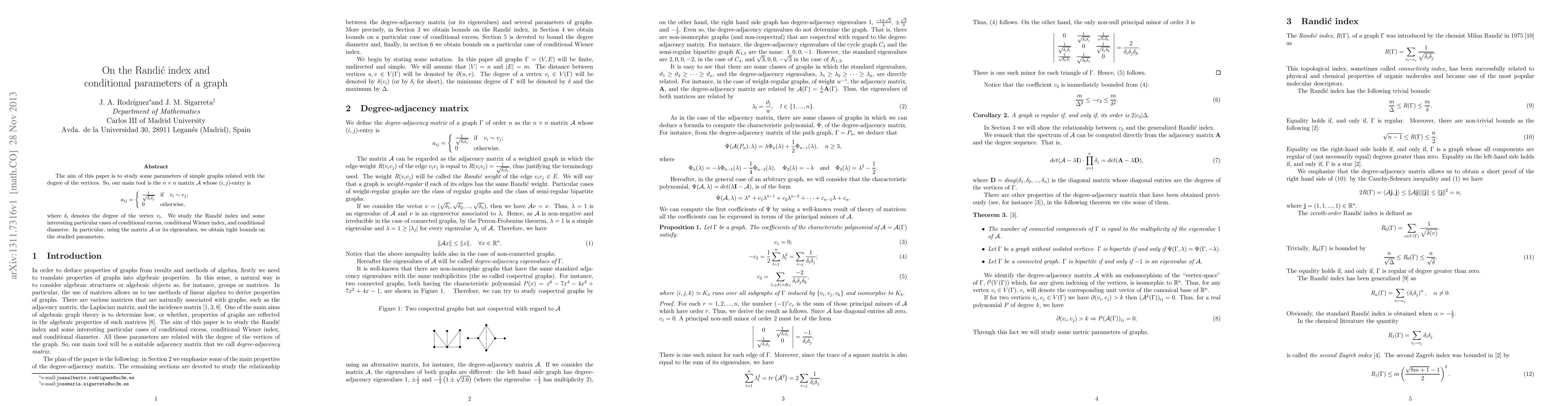 The aim of this paper is to study some parameters of simple graphs related with the degree of the vertices. So, our main tool is the $n\times n$ matrix ${\cal A}$ whose ($i,j$)-entry is $$ a_{ij}= \left\lbrace \begin{array}{ll} \frac{1}{\sqrt{\delta_i\delta_j}} & {\rm if }\quad v_i\sim v_j ; \\ 0 & {\rm otherwise,} \end{array} \right. $$ where $\delta_i$ denotes the degree of the vertex $v_i$. We study the Randi\'{c} index and some interesting particular cases of conditional excess, conditional Wiener index, and conditional diameter. In particular, using the matrix ${\cal A}$ or its eigenvalues, we obtain tight bounds on the studied parameters.