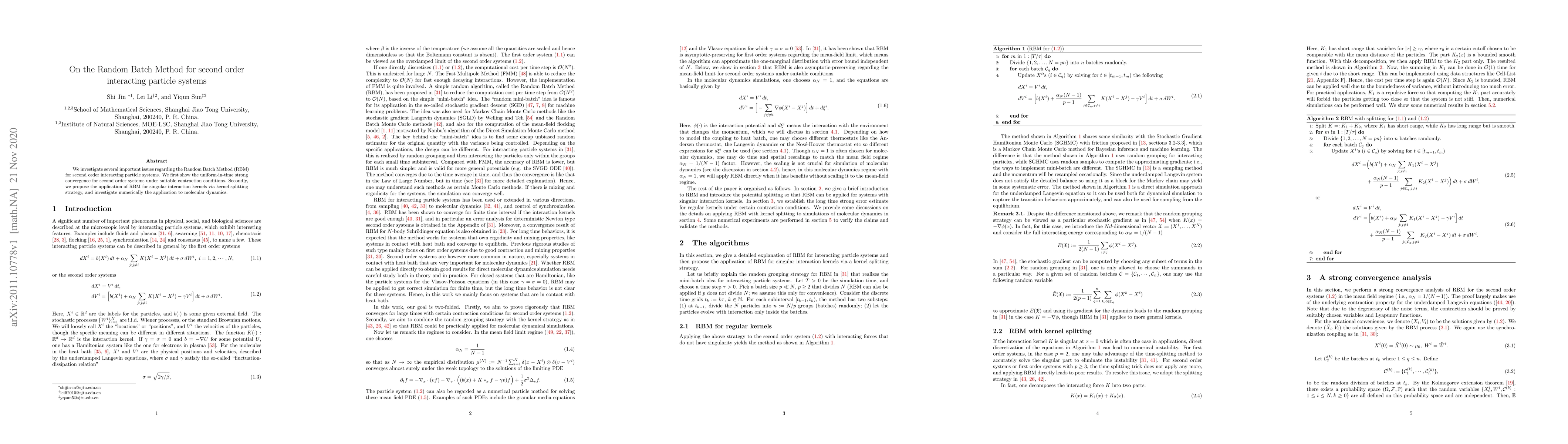 This paper examines the Random Batch Method (RBM) for second order interacting particle systems, demonstrating uniform-in-time strong convergence under contraction conditions. It also introduces a kernel splitting strategy for singular interaction kernels and explores its application in molecular dynamics simulations.