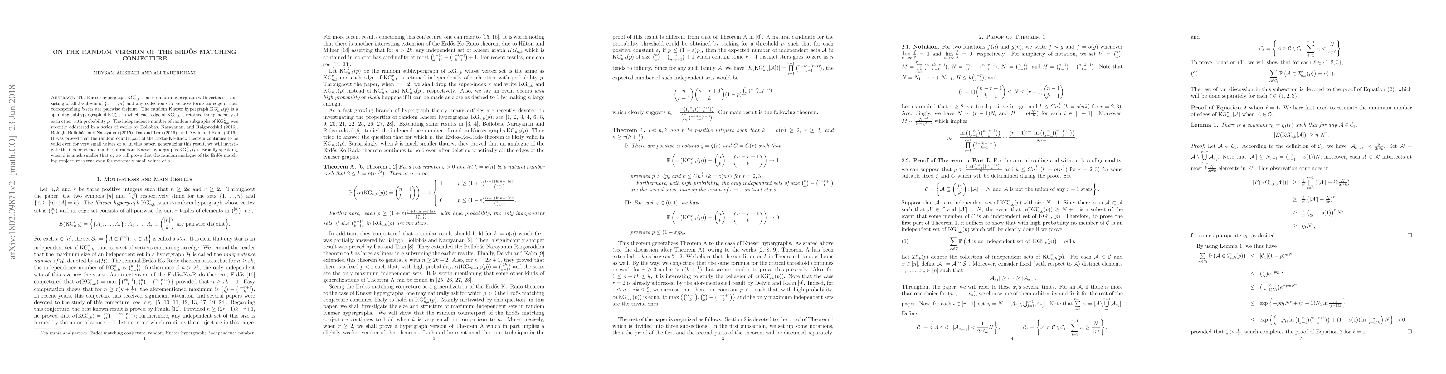 The Kneser hypergraph ${\rm KG}^r_{n,k}$ is an $r$-uniform hypergraph with vertex set consisting of all $k$-subsets of $\{1,\ldots,n\}$ and any collection of $r$ vertices forms an edge if their corresponding $k$-sets are pairwise disjoint. The random Kneser hypergraph ${\rm KG}^r_{n,k}(p)$ is a spanning subhypergraph of ${\rm KG}^r_{n,k}$ in which each edge of ${\rm KG}^r_{n,k}$ is retained independently of each other with probability $p$. The independence number of random subgraphs of ${\rm KG}^2_{n,k}$ was recently addressed in a series of works by Bollob{\'a}s, Narayanan, and Raigorodskii (2016), Balogh, Bollob{\'a}s, and Narayanan (2015), Das and Tran (2016), and Devlin and Kahn (2016). It was proved that the random counterpart of the Erd\H{o}s-Ko-Rado theorem continues to be valid even for very small values of $p$. In this paper, generalizing this result, we will investigate the independence number of random Kneser hypergraphs ${\rm KG}^r_{n,k}(p)$. Broadly speaking, when $k$ is much smaller that $n$, we will prove that the random analogue of the Erd\H{o}s matching conjecture is true even for extremely small values of $p$.