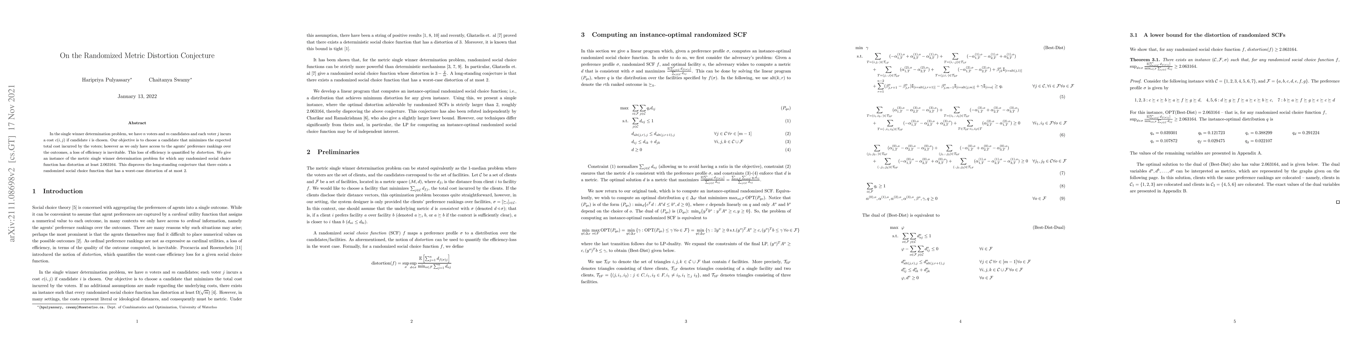 A research paper disproves the Randomized Metric Distortion Conjecture, showing that a randomized social choice function cannot achieve distortion of 2 or less in a specific single winner determination problem, with an upper bound of 2.063164.