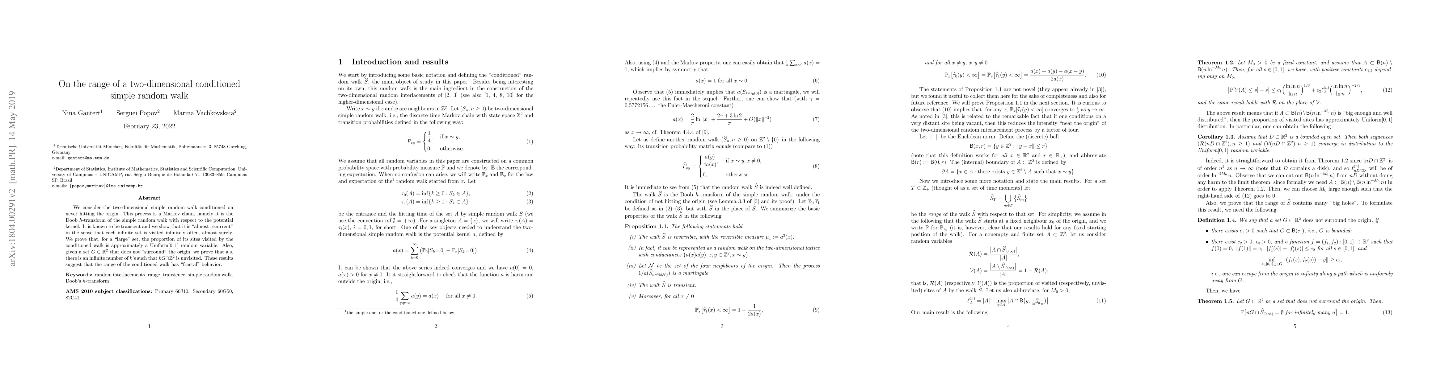 This paper studies the two-dimensional simple random walk conditioned to avoid the origin, demonstrating its "almost recurrent" nature and proving that the proportion of large sets visited follows a Uniform$[0,1]$ distribution. It also shows that for sets not surrounding the origin, there are infinitely many scales where the set remains unvisited, indicating fractal-like behavior in the walk's range.