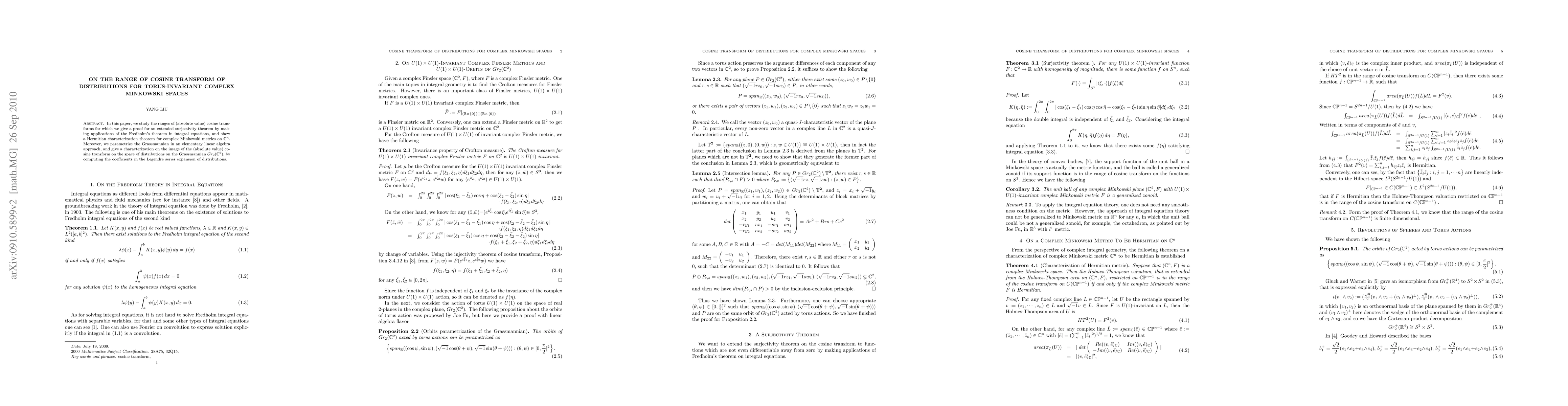 In this paper, we study the range of (absolute value) cosine transforms for which we give a proof for an extended surjectivity theorem by making applications of the Fredholm's theorem in integral equations, and show a Hermitian characterization theorem for complex Minkowski metrics on \mathbb{C}^n. Moreover, we parametrize the Grassmannian in an elementary linear algebra approach, and give a characterization on the image of the (absolute value) cosine transform on the space of distributions on the Grassmannian Gr_{2}(\mathbb{C}^{2}), by computing the coefficients in the Legendre series expansion of distributions.