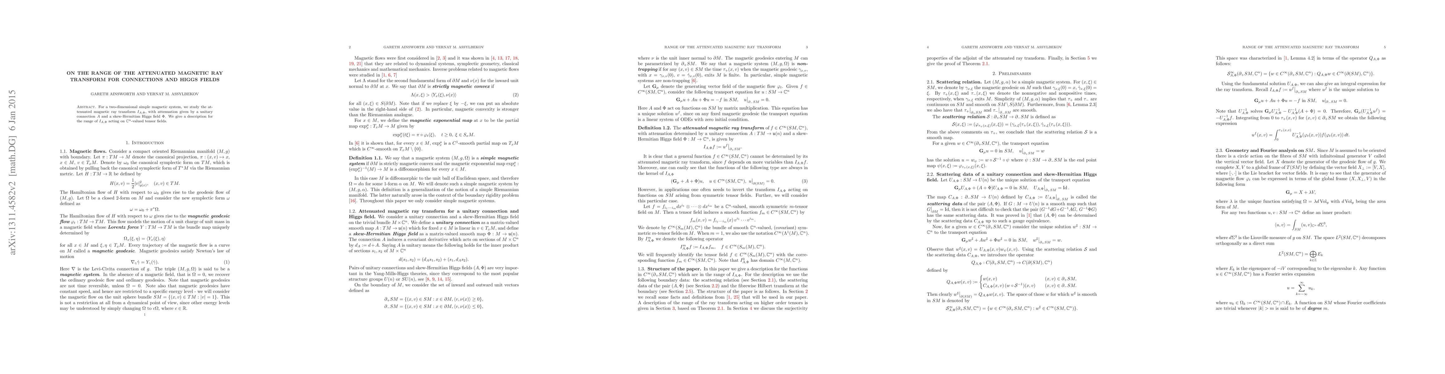 For a two-dimensional simple magnetic system, we study the attenuated magnetic ray transform $I_{A,\Phi}$, with attenuation given by a unitary connection $A$ and a skew-Hermitian Higgs field $\Phi$. We give a description for the range of $I_{A,\Phi}$ acting on $\mathbb C^n$-valued tensor fields.