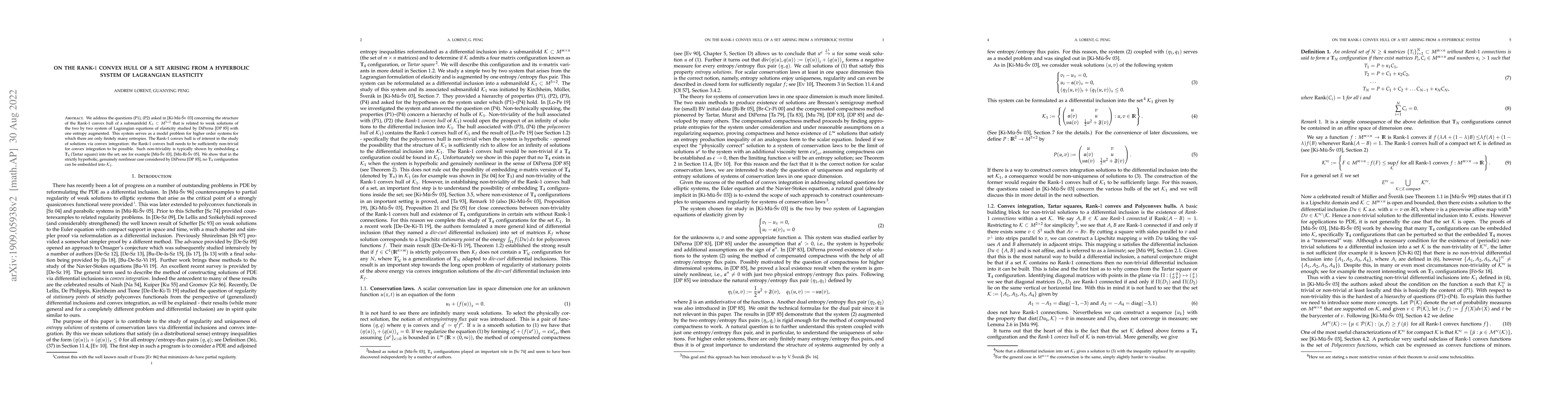 We address the questions (P1), (P2) asked in Kirchheim-M\"{u}ller-\v{S}ver\'{a}k (2003) concerning the structure of the Rank-$1$ convex hull of a submanifold $\mathcal{K}_1\subset M^{3\times 2}$ that is related to weak solutions of the two by two system of Lagrangian equations of elasticity studied by DiPerna (1985) with one entropy augmented. This system serves as a model problem for higher order systems for which there are only finitely many entropies. The Rank-$1$ convex hull is of interest in the study of solutions via convex integration: the Rank-$1$ convex hull needs to be sufficiently non-trivial for convex integration to be possible. Such non-triviality is typically shown by embedding a $\mathbb{T}_4$ (Tartar square) into the set. We show that in the strictly hyperbolic, genuinely nonlinear case considered by DiPerna (1985), no $\mathbb{T}_4$ configuration can be embedded into $\mathcal{K}_1$.