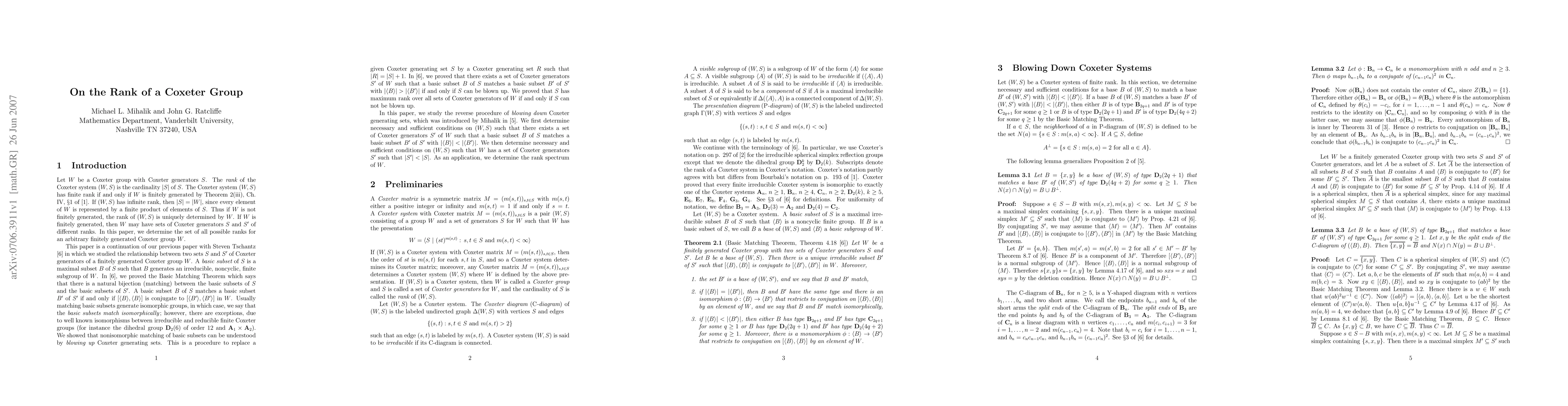 Let W be a Coxeter group with Coxeter generators S. The rank of the Coxeter system (W,S) is the cardinality |S| of S. The Coxeter system (W,S) has finite rank if and only if W is finitely generated. If (W,S) has infinite rank, then |S| = |W|, since every element of W is represented by a finite product of elements of S. Thus if W is not finitely generated, the rank of (W,S) is uniquely determined by W. If W is finitely generated, then W may have sets of Coxeter generators S and S' of different ranks. In this paper, we determine the set of all possible ranks for an arbitrary finitely generated Coxeter group W.