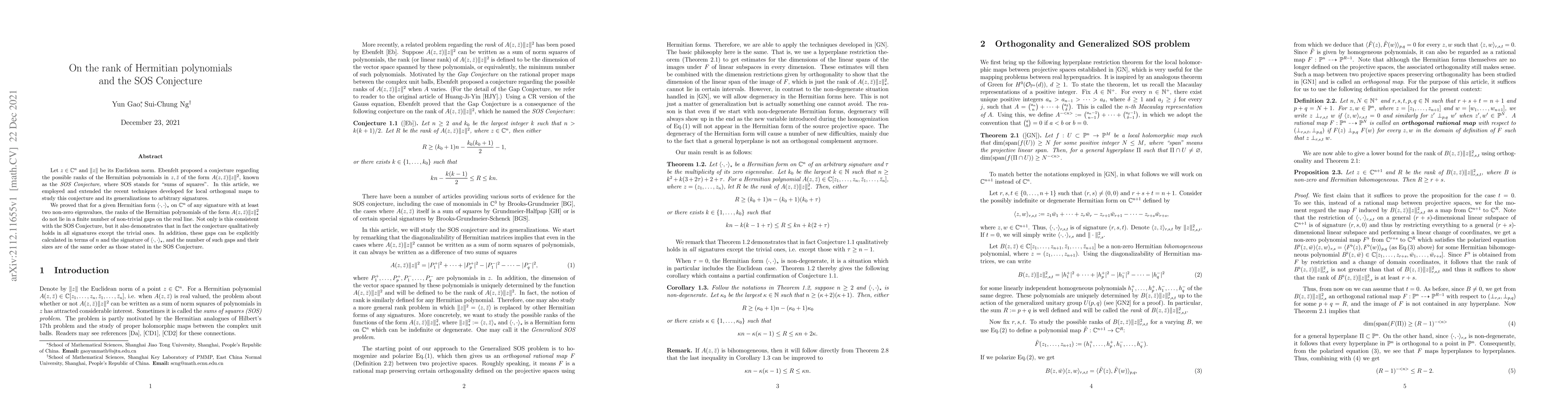 Let $z\in\mathbb C^n$ and $\|z\|$ be its Euclidean norm. Ebenfelt proposed a conjecture regarding the possible ranks of the Hermitian polynomials in $z,\bar z$ of the form $A(z,\bar z)\|z\|^2$, known as the SOS Conjecture, where SOS stands for "sums of squares". In this article, we employed and extended the recent techniques developed for local orthogonal maps to study this conjecture and its generalizations to arbitrary signatures. We proved that for a given Hermitian form $\langle\cdot,\cdot\rangle_\star$ on $\mathbb C^n$ of any signature with at least two non-zero eigenvalues, the ranks of the Hermitian polynomials of the form $A(z,\bar z)\|z\|^2_\star$ do not lie in a finite number of non-trivial gaps on the real line. Not only is this consistent with the SOS Conjecture, but it also demonstrates that in fact the conjecture qualitatively holds in all signatures except the trivial ones. In addition, these gaps can be explicitly calculated in terms of $n$ and the signature of $\langle\cdot,\cdot\rangle_\star$, and the number of such gaps and their sizes are of the same order as those stated in the SOS Conjecture.
