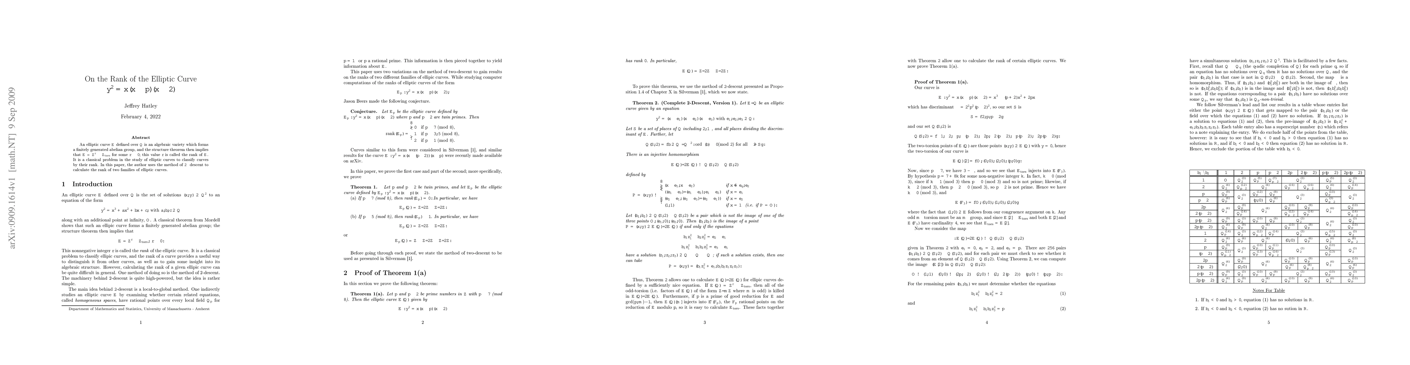An elliptic curve E defined over \Q is an algebraic variety which forms a finitely generated abelian group, and the structure theorem then implies that E = \Z^r + \Z_{tors} for some r \geq 0; this value r is called the rank of E. It is a classical problem in the study of elliptic curves to classify curves by their rank. In this paper, the author uses the method of 2-descent to calculate the rank of two families of elliptic curves, where E is given by E: y^2 = x(x-p)(x-2) with p, p-2 being twin primes.