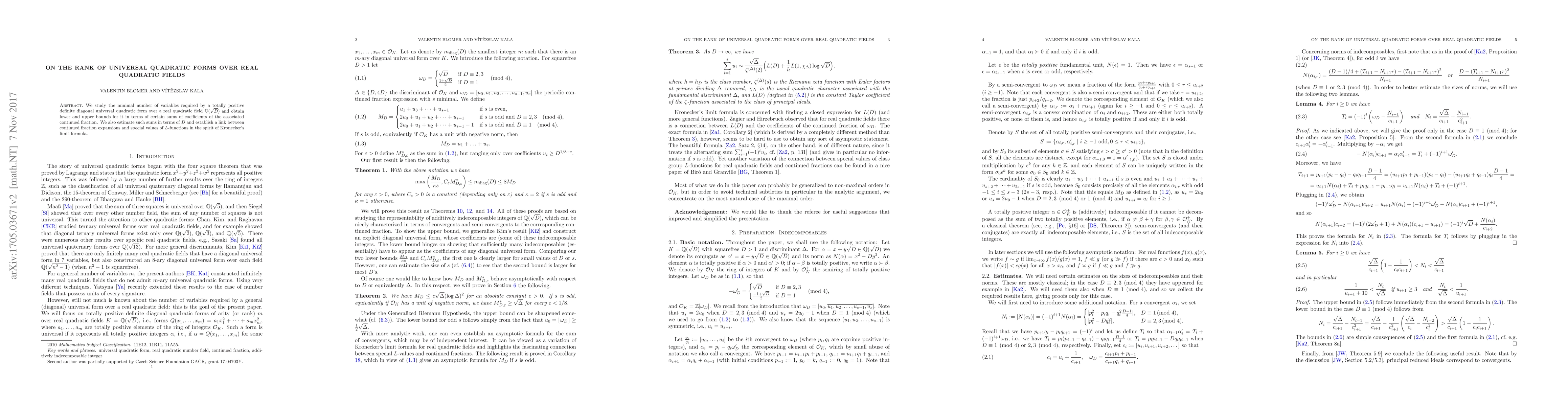 This paper investigates the minimal number of variables for a universal quadratic form over real quadratic fields, deriving bounds linked to the sums of coefficients from continued fractions and establishing connections to $L$-functions via Kronecker's limit formula.