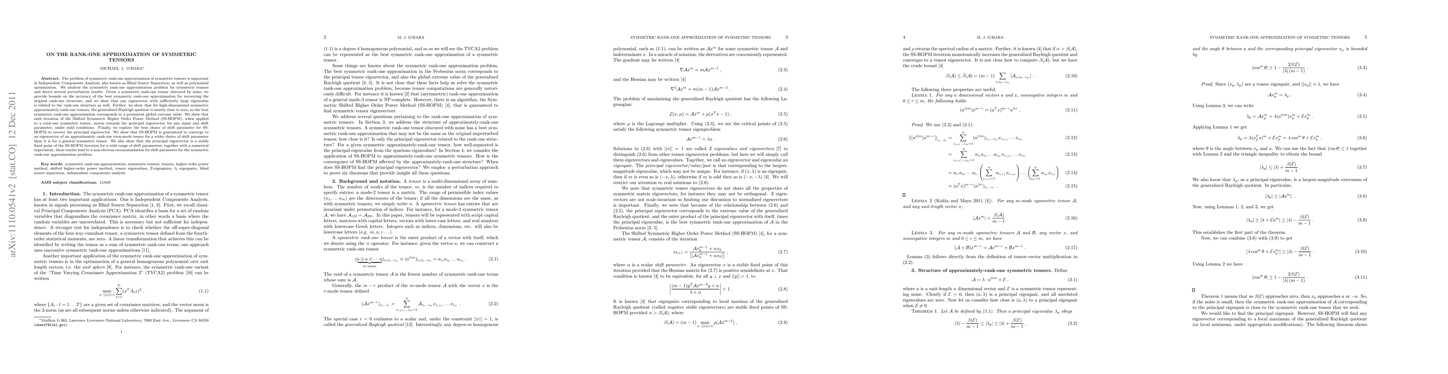 This paper investigates the symmetric rank-one approximation of tensors, focusing on its applications in Independent Components Analysis and polynomial optimization. It provides bounds on the accuracy of approximations and demonstrates the convergence of the Shifted Symmetric Higher Order Power Method (SS-HOPM) towards the principal eigenvector under mild conditions, offering insights into optimal shift parameter choices for effective tensor recovery.