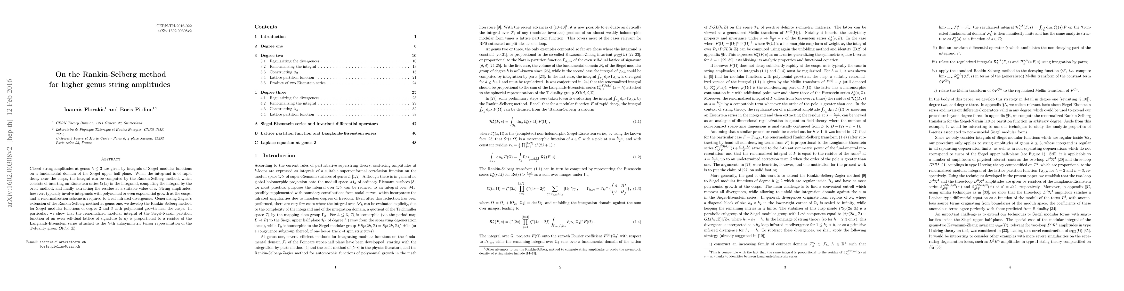 Closed string amplitudes at genus $h\leq 3$ are given by integrals of Siegel modular functions on a fundamental domain of the Siegel upper half-plane. When the integrand is of rapid decay near the cusps, the integral can be computed by the Rankin-Selberg method, which consists of inserting an Eisenstein series $E_h(s)$ in the integrand, computing the integral by the orbit method, and finally extracting the residue at a suitable value of $s$. String amplitudes, however, typically involve integrands with polynomial or even exponential growth at the cusps, and a renormalization scheme is required to treat infrared divergences. Generalizing Zagier's extension of the Rankin-Selberg method at genus one, we develop the Rankin-Selberg method for Siegel modular functions of degree 2 and 3 with polynomial growth near the cusps. In particular, we show that the renormalized modular integral of the Siegel-Narain partition function of an even self-dual lattice of signature $(d,d)$ is proportional to a residue of the Langlands-Eisenstein series attached to the $h$-th antisymmetric tensor representation of the T-duality group $O(d,d,Z)$.