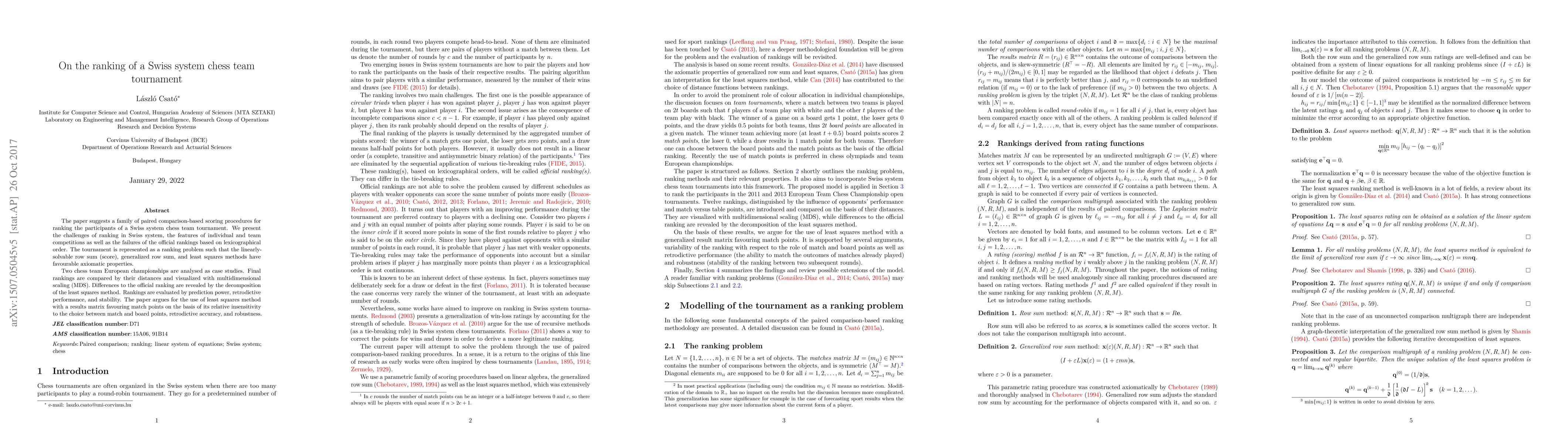 This paper proposes new paired comparison-based scoring methods for ranking teams in Swiss system chess tournaments, analyzing two European championships to compare these methods against official rankings. The least squares method is recommended for its robustness, retrodictive accuracy, and stability.