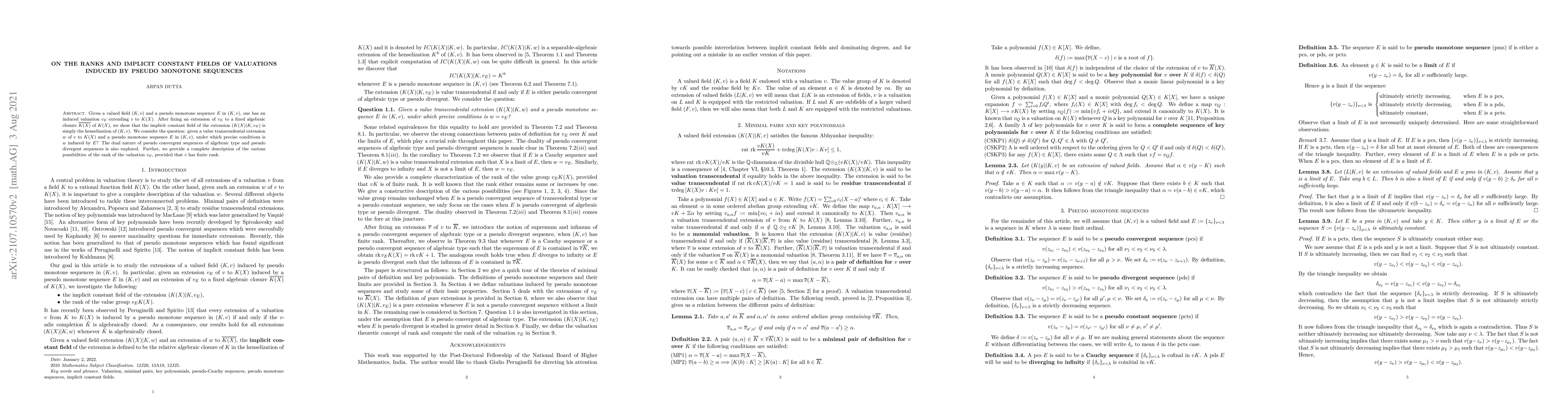 This paper investigates valuations induced by pseudo monotone sequences in valued fields, showing that the implicit constant field of such extensions is the henselization of the base field. It also explores conditions under which a transcendental extension is induced by a pseudo monotone sequence and describes the rank of these valuations when the base valuation has finite rank.