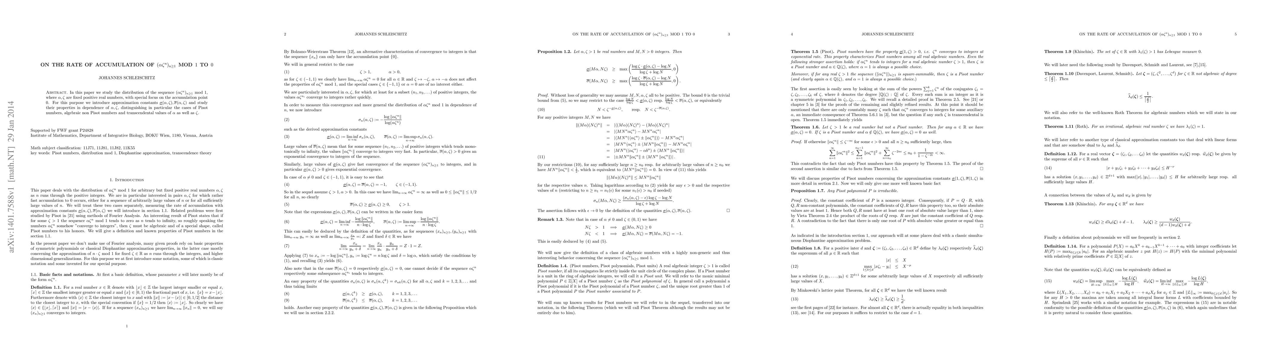 In this paper we study the distribution of the sequence $(\alpha \zeta^{n})_{n\geq 1}$ mod $1$, where $\alpha,\zeta$ are fixed positive real numbers, with special focus on the accumulation point $0$. For this purpose we introduce approximation constants $\underline{\sigma}(\alpha,\zeta),\overline{\sigma}(\alpha, \zeta)$ and study their properties in dependence of $\alpha,\zeta$, distinguishing in particular the cases of Pisot numbers, algebraic non Pisot numbers and transcendental values of $\alpha$ as well as $\zeta$.