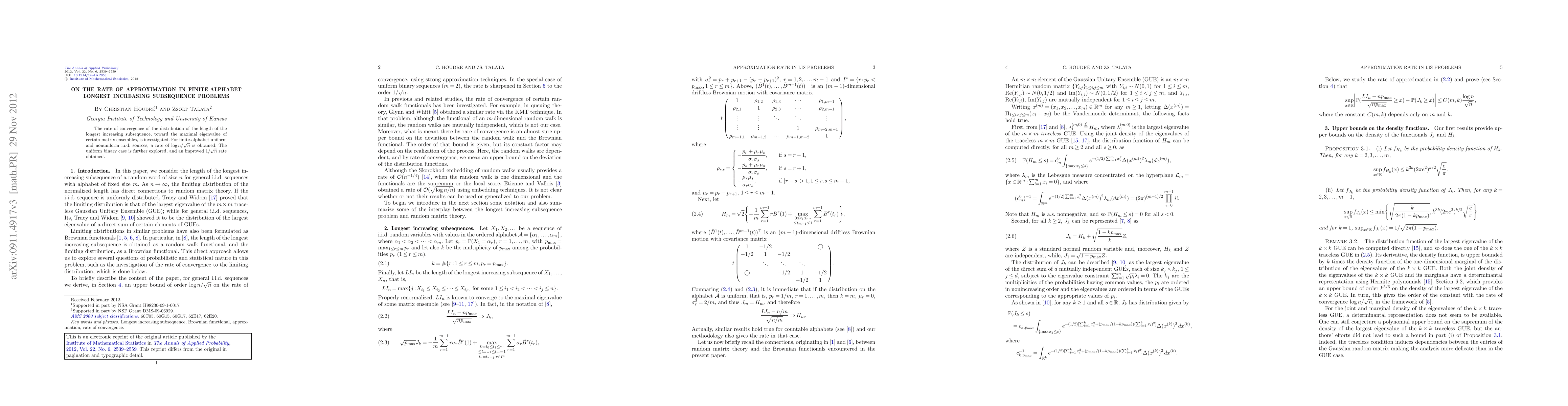 The rate of convergence of the distribution of the length of the longest increasing subsequence, toward the maximal eigenvalue of certain matrix ensembles, is investigated. For finite-alphabet uniform and nonuniform i.i.d. sources, a rate of $\log n/\sqrt{n}$ is obtained. The uniform binary case is further explored, and an improved $1/\sqrt{n}$ rate obtained.