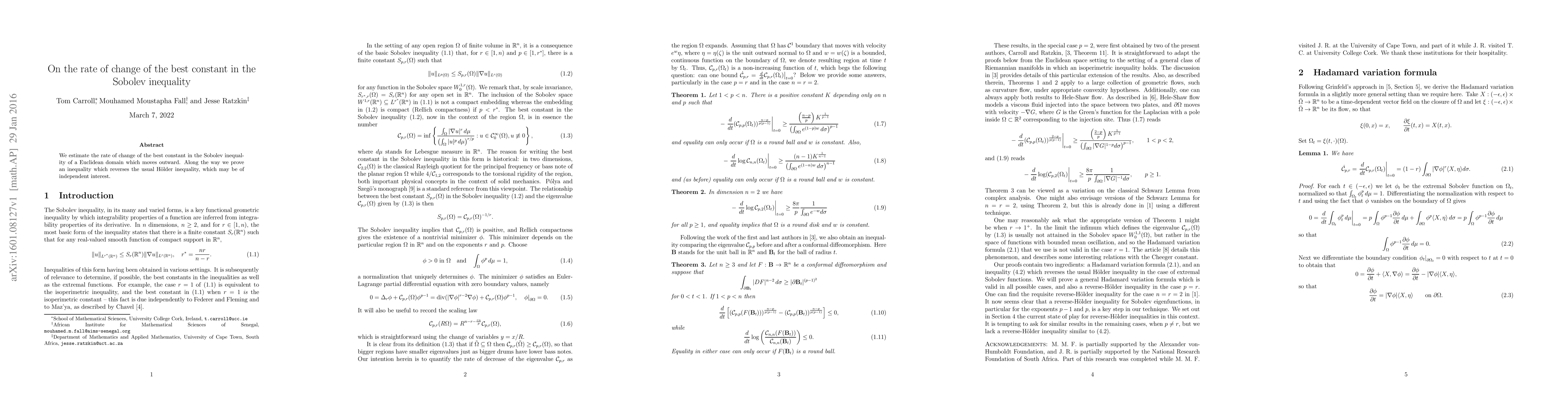 We estimate the rate of change of the best constant in the Sobolev inequality of a Euclidean domain which moves outward. Along the way we prove an inequality which reverses the usual Holder inequality, which may be of independent interest.