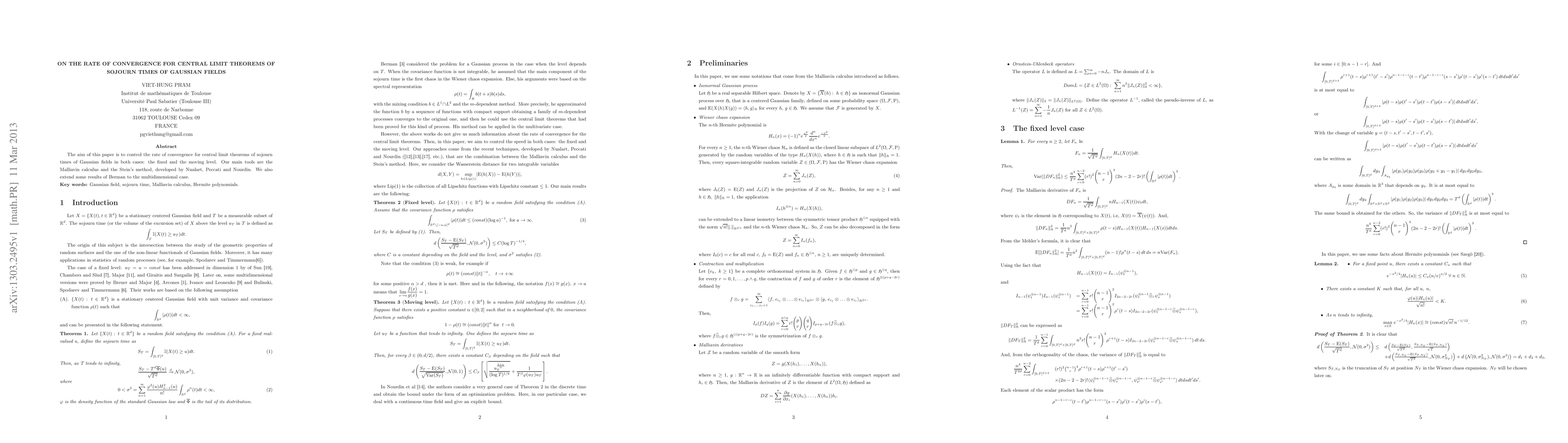 This paper investigates the rate of convergence for central limit theorems of Gaussian fields' sojourn times, employing Malliavin calculus and Stein's method. It extends Berman's results to multidimensional cases and considers both fixed and moving level scenarios.