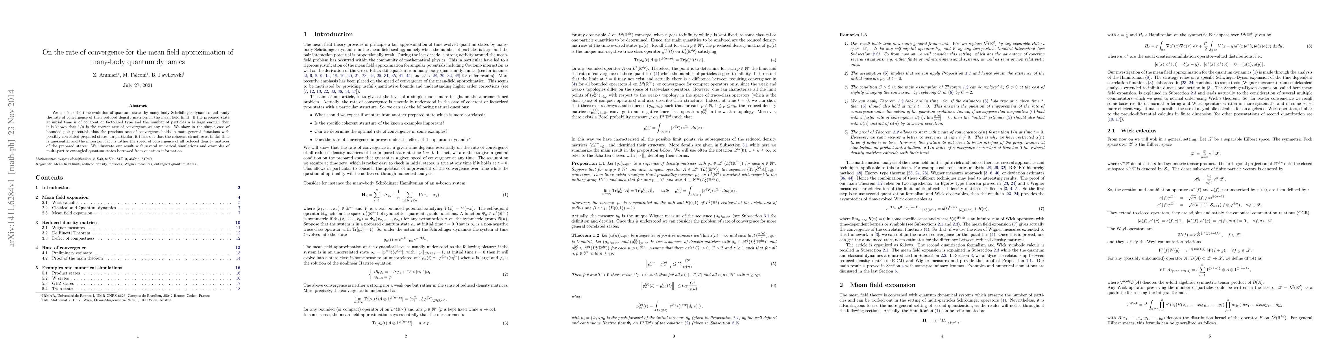 This research paper investigates the convergence rate of quantum states' reduced density matrices in mean field approximations of many-body Schrödinger dynamics. It demonstrates that the $1/n$ convergence rate holds even for correlated initial states and bounded pair potentials, emphasizing the convergence speed of all reduced density matrices. The findings are supported by numerical simulations and examples of multi-partite entangled quantum states.