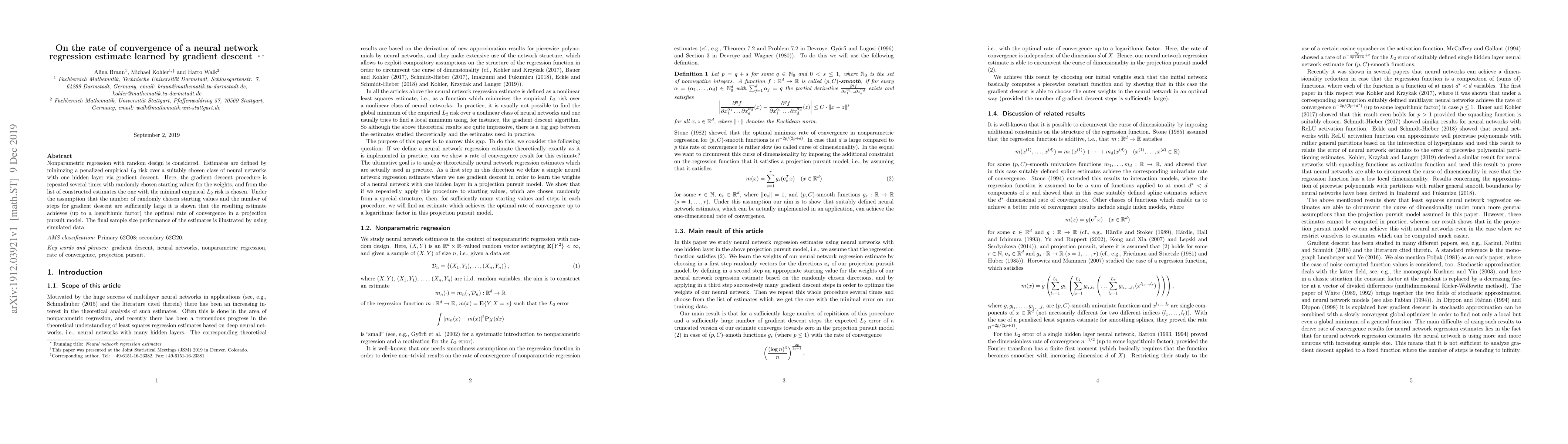 This paper investigates the convergence rate of neural network regression estimates learned through gradient descent, showing that under certain conditions, the method achieves optimal convergence rates in a projection pursuit model. The approach involves multiple gradient descent runs with random starting values, and the best estimate is selected based on minimal empirical $L_2$ risk.
