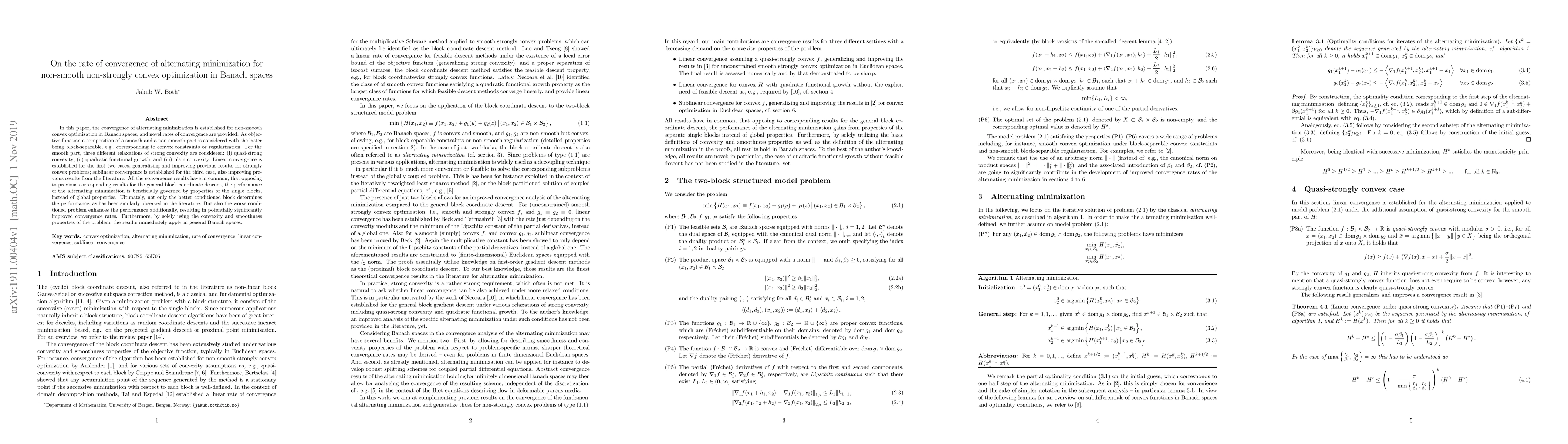 This paper establishes convergence rates for alternating minimization in non-smooth convex optimization within Banach spaces, providing linear convergence for quasi-strong convexity and quadratic functional growth, and sublinear convergence for plain convexity. The method benefits from properties of individual blocks rather than global properties, potentially improving convergence rates.