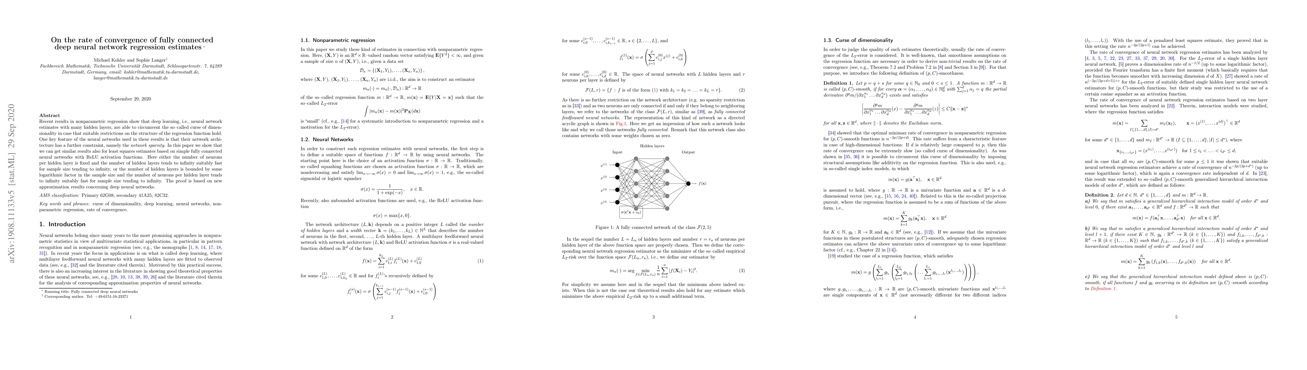 Recent results in nonparametric regression show that deep learning, i.e., neural network estimates with many hidden layers, are able to circumvent the so-called curse of dimensionality in case that suitable restrictions on the structure of the regression function hold. One key feature of the neural networks used in these results is that their network architecture has a further constraint, namely the network sparsity. In this paper we show that we can get similar results also for least squares estimates based on simple fully connected neural networks with ReLU activation functions. Here either the number of neurons per hidden layer is fixed and the number of hidden layers tends to infinity suitably fast for sample size tending to infinity, or the number of hidden layers is bounded by some logarithmic factor in the sample size and the number of neurons per hidden layer tends to infinity suitably fast for sample size tending to infinity. The proof is based on new approximation results concerning deep neural networks.