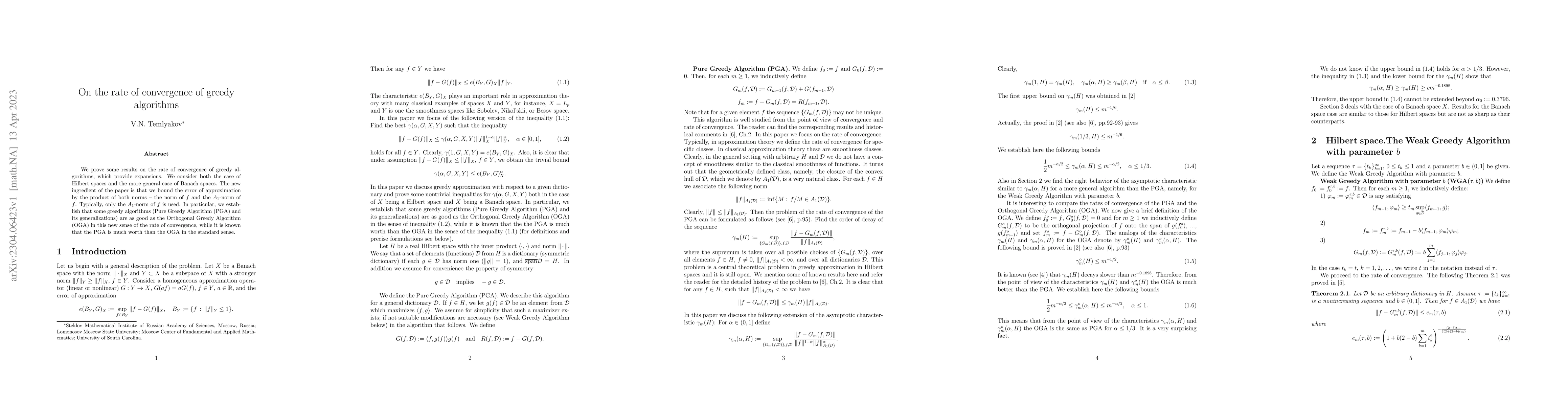 This paper investigates the rate of convergence of greedy algorithms in both Hilbert and Banach spaces, introducing a new error bound that combines the norm of $f$ and the $A_1$-norm of $f$. It demonstrates that certain greedy algorithms, like the Pure Greedy Algorithm, can match the Orthogonal Greedy Algorithm in this novel convergence rate, despite being superior in standard measures.