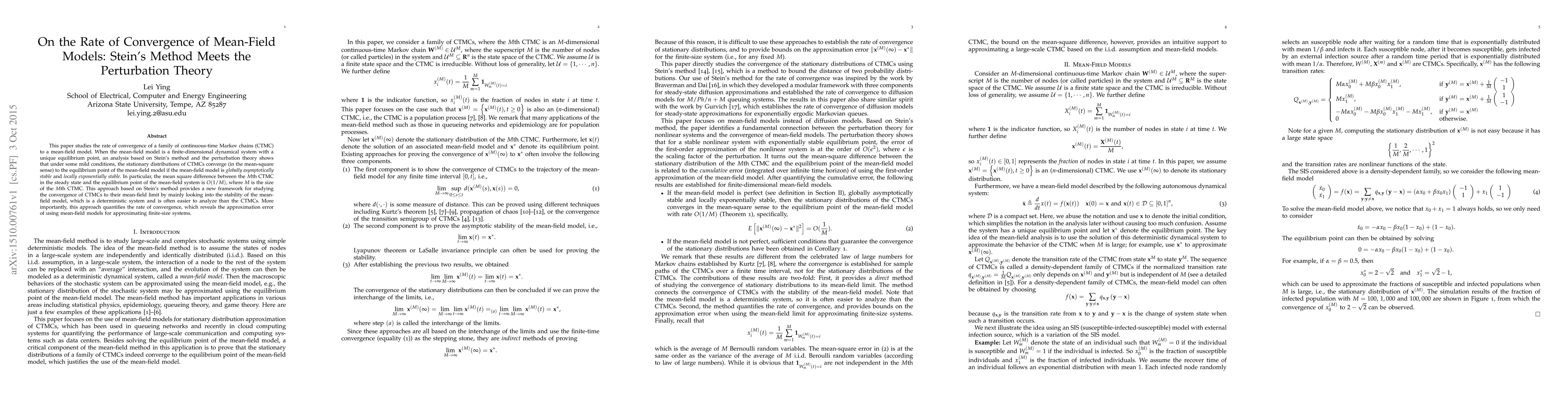 This paper uses Stein's method and perturbation theory to analyze the convergence rate of continuous-time Markov chains (CTMCs) to a mean-field model, showing that under certain stability conditions, the stationary distributions converge at a rate of $O(1/M)$. The approach provides a new framework for quantifying the approximation error of mean-field models.