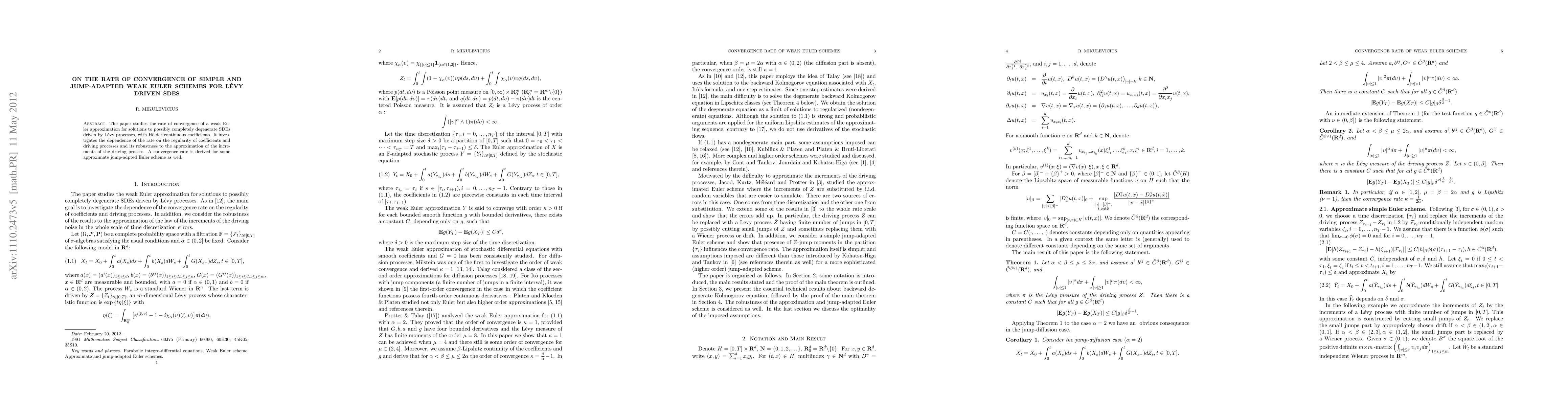 The paper examines the convergence rate of weak Euler schemes for Lévy-driven SDEs with Hölder-continuous coefficients, analyzing how the rate depends on the regularity of coefficients and processes, and deriving a convergence rate for an approximate jump-adapted scheme. Robustness to the approximation of driving process increments is also considered.