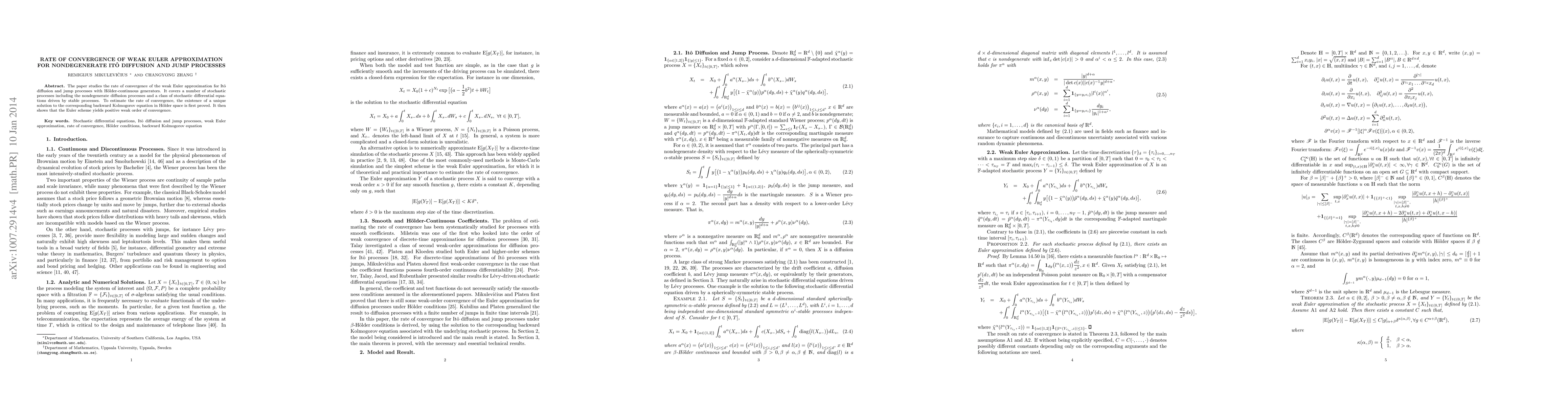 The paper investigates the rate of convergence for weak Euler approximation in It\^{o} diffusion and jump processes with H\"{o}lder-continuous generators, proving the existence of a unique solution to the backward Kolmogorov equation and demonstrating positive weak order of convergence for the Euler scheme.