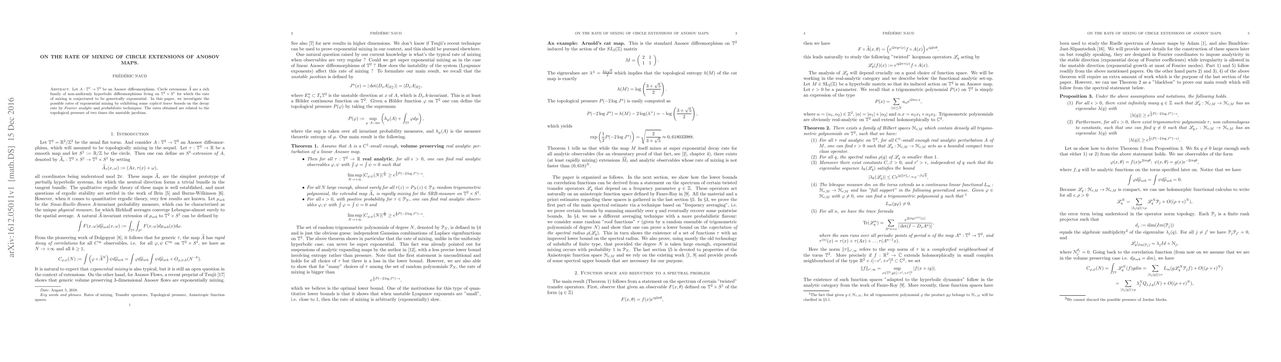 This paper explores the mixing rates of circle extensions of analytic Anosov maps on the two torus, proving explicit lower bounds for mixing involving topological pressure. It specifically examines the case where the extension function is a random trigonometric polynomial.