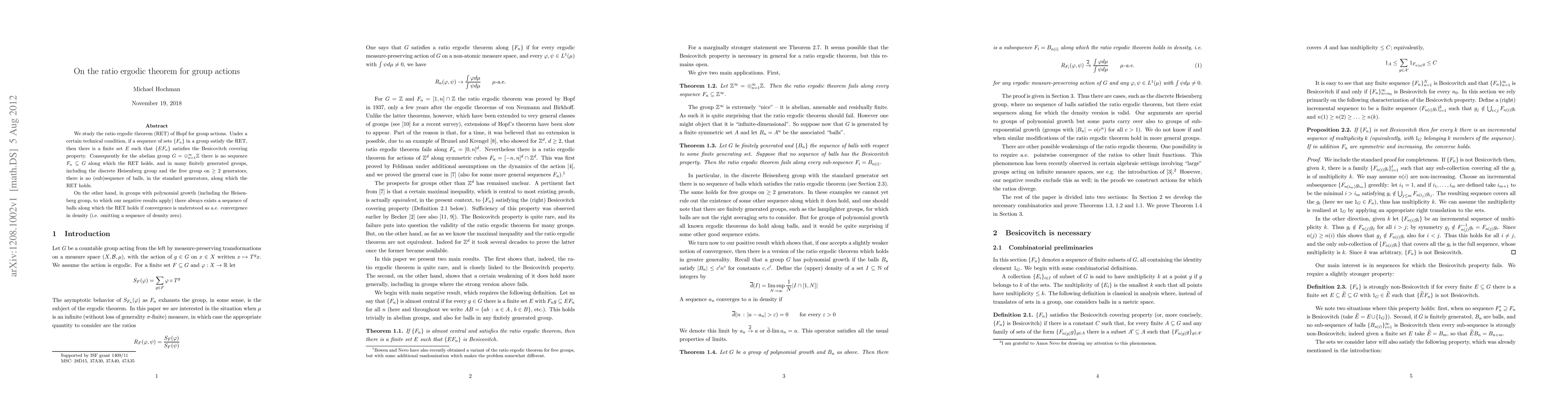 This paper investigates the ratio ergodic theorem for group actions, proving that under certain conditions, sequences of sets satisfying the theorem lead to sets with the Besicovitch covering property. It concludes that no such sequences exist for free abelian groups of infinite rank or for many finitely generated groups, but sequences of balls in groups with polynomial growth do satisfy the theorem under almost everywhere convergence in density.