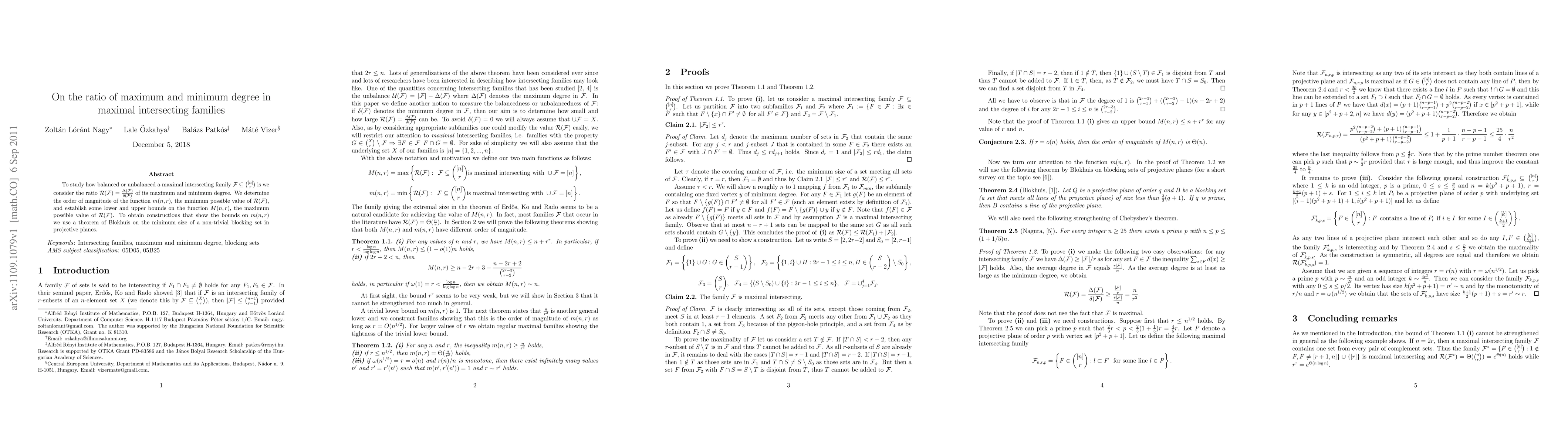 This paper studies maximal intersecting families in combinatorics, focusing on the ratio of maximum to minimum degree, and establishes bounds for this ratio.