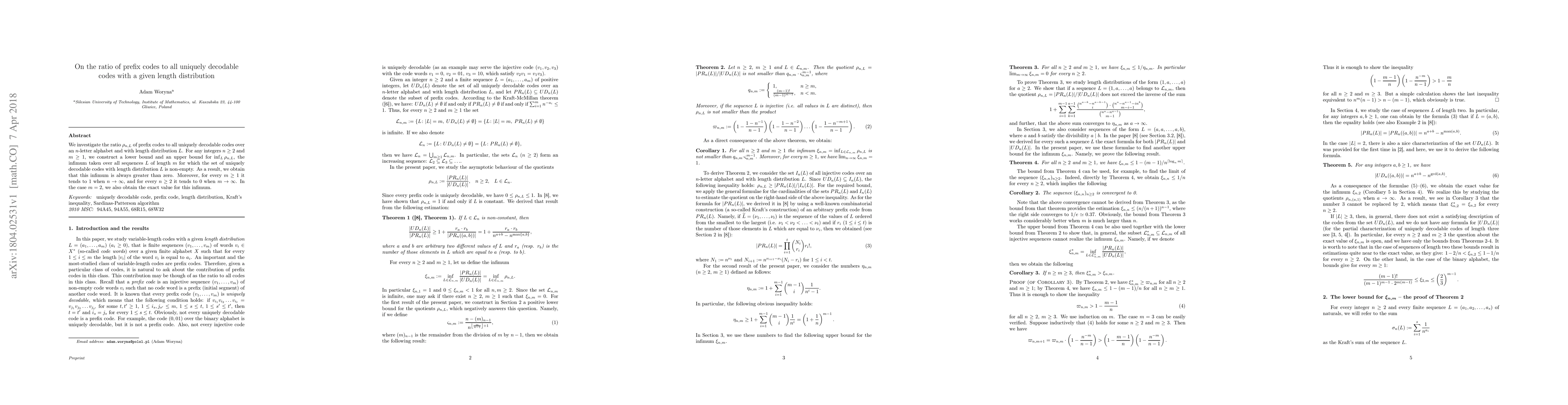 We investigate the ratio $\rho_{n,L}$ of prefix codes to all uniquely decodable codes over an $n$-letter alphabet and with length distribution $L$. For any integers $n\geq 2$ and $m\geq 1$, we construct a lower bound and an upper bound for $\inf_L\rho_{n,L}$, the infimum taken over all sequences $L$ of length $m$ for which the set of uniquely decodable codes with length distribution $L$ is non-empty. As a result, we obtain that this infimum is always greater than zero. Moreover, for every $m\geq 1$ it tends to 1 when $n\to\infty$, and for every $n\geq 2$ it tends to 0 when $m\to\infty$. In the case $m=2$, we also obtain the exact value for this infimum.