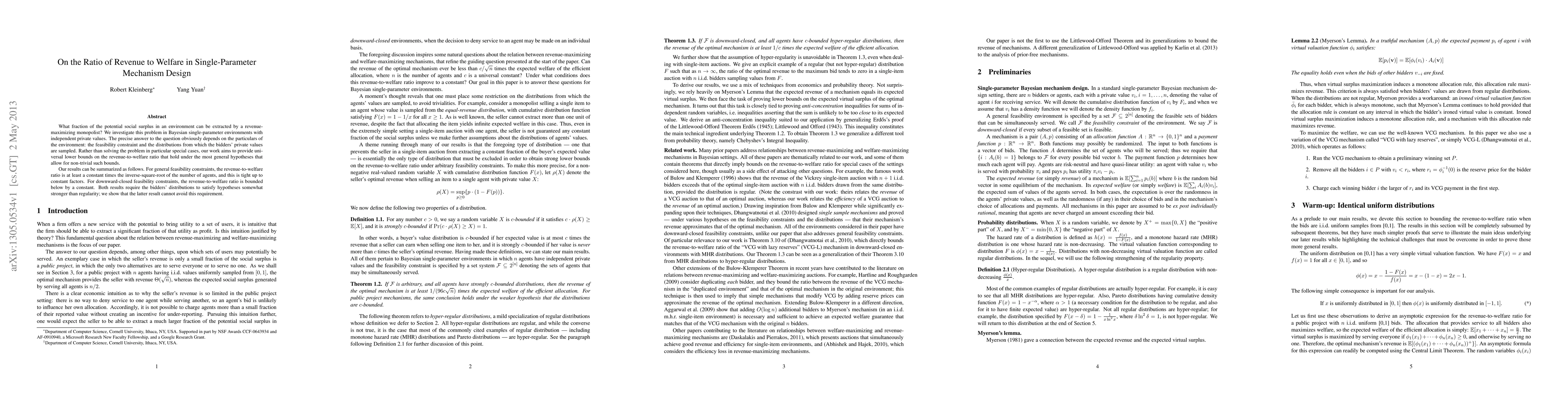 This paper investigates the revenue-to-welfare ratio in single-parameter mechanism design, providing universal lower bounds for general and downward-closed feasibility constraints. It finds that the ratio is at least a constant times the inverse-square-root of the number of agents, and for downward-closed constraints, it is bounded below by a constant.