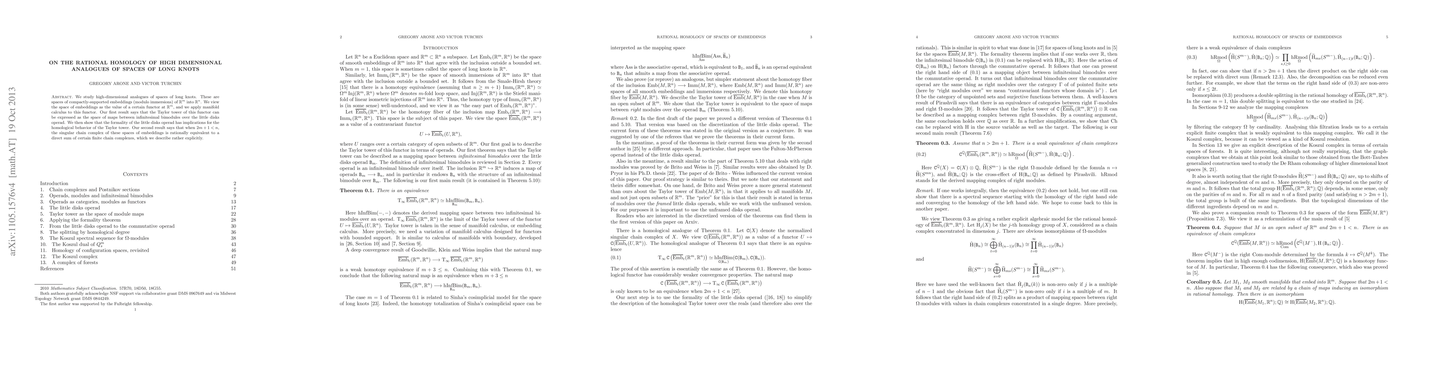 This paper explores high-dimensional analogues of spaces of long knots, employing manifold calculus and the little disks operad. It demonstrates that these spaces' Taylor towers relate to maps between infinitesimal bimodules, and when $2m+1<n$, their singular chain complexes are rationally equivalent to a direct sum of specific finite chain complexes.