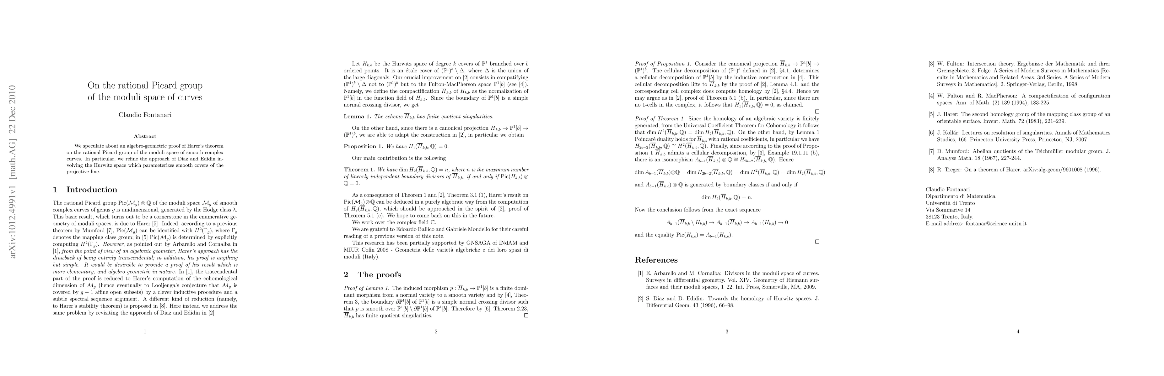 We speculate about an algebro-geometric proof of Harer's theorem on the rational Picard group of the moduli space of smooth complex curves. In particular, we refine the approach of Diaz and Edidin involving the Hurwitz space which parameterizes smooth covers of the projective line.
