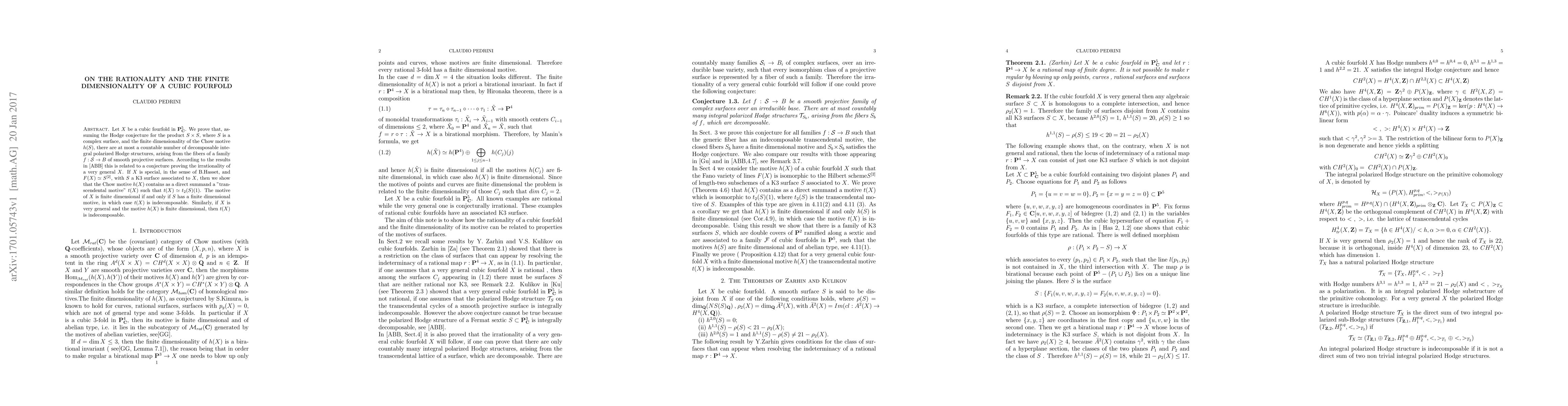 Let $X$ be a cubic fourfold in $P^5_{C}$. We prove that, assuming the Hodge conjecture for the product $S \times S$, where $S$ is a complex surface, and the finite dimensionality of the Chow motive $h(S)$, there are at most a countable number of decomposable integral polarized Hodge structures, arising from the fibers of a family of smooth projective surfaces. According to the results in [ABB] this is related to a conjecture proving the irrationality of a very general $X$. If $X$ is special, in the sense of B.Hasset, and $F(X) \simeq S^{[2]}$, with $S$ a K3 surface associated to $X$, then we show that the Chow motive $h(X)$ contains as a direct summand a "transcendental motive" $t(X)$ such that $t(X)\simeq t_2(S)(1)$. The motive of $X$ is finite dimensional if and only if $S$ has a finite dimensional motive, in which case $t(X)$ is indecomposable. Similarly, if $X$ is very general and the motive $h(X)$ is finite dimensional, then $t(X)$ is indecomposable