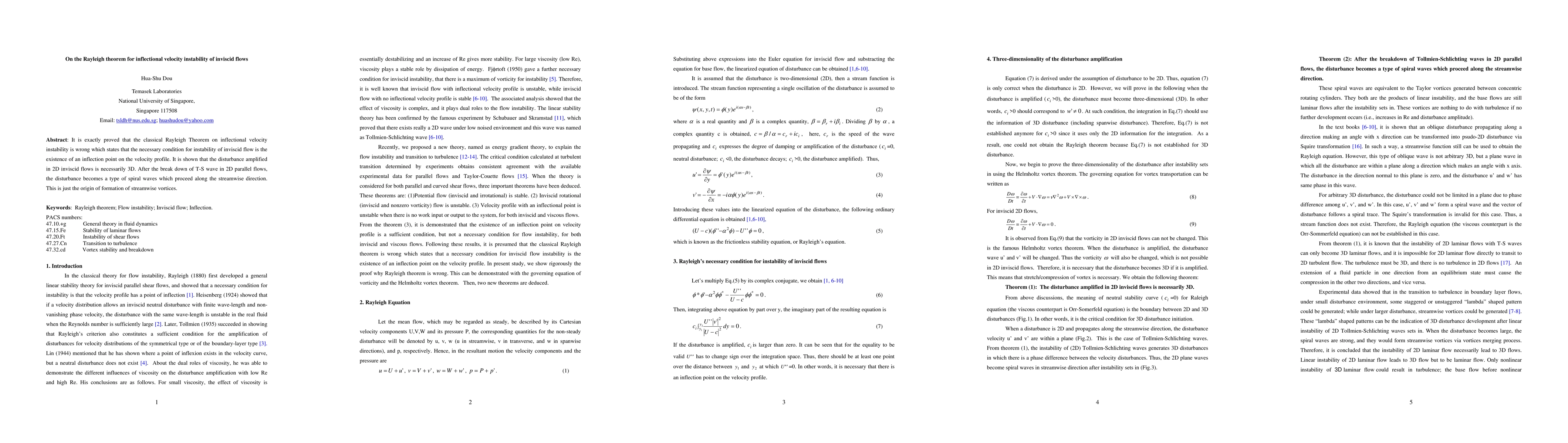 The Rayleigh theorem is proven incorrect for inviscid flows, revealing that 3D disturbances occur even in 2D flows, leading to the formation of streamwise vortices.