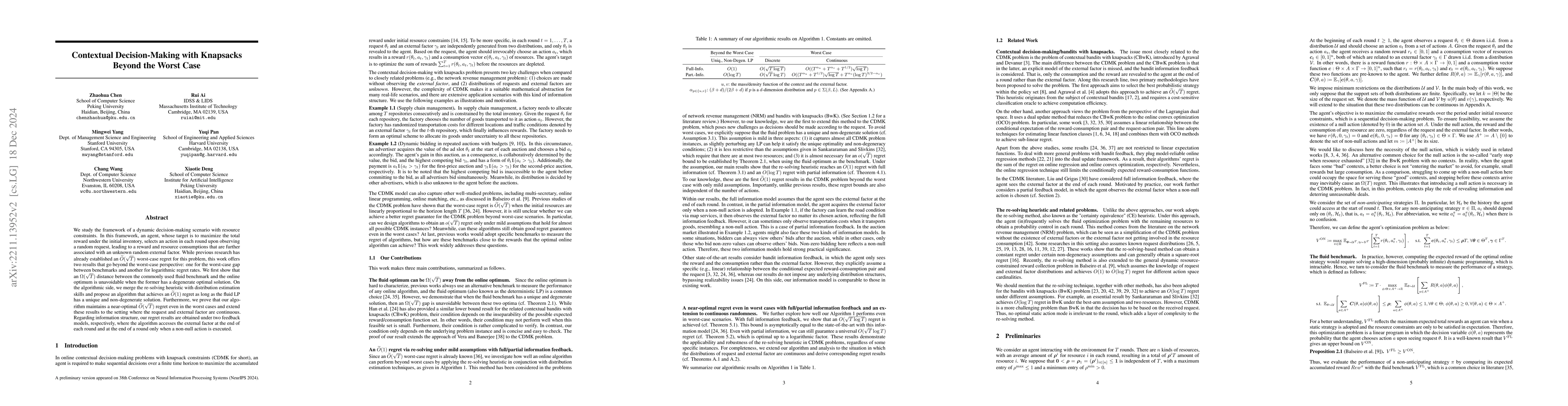 This paper proposes a re-solving heuristic combined with distribution estimation techniques to tackle the (binary) contextual bandits with knapsacks problem. The authors achieve $\widetilde O(T^{\alpha_u} + T^{\alpha_v} + T^{1/2})$ regret for general problems and $\widetilde O(1)$ regret when the fluid problem is linear programming with a unique optimal solution, marking the first such result in the CBwK problem.