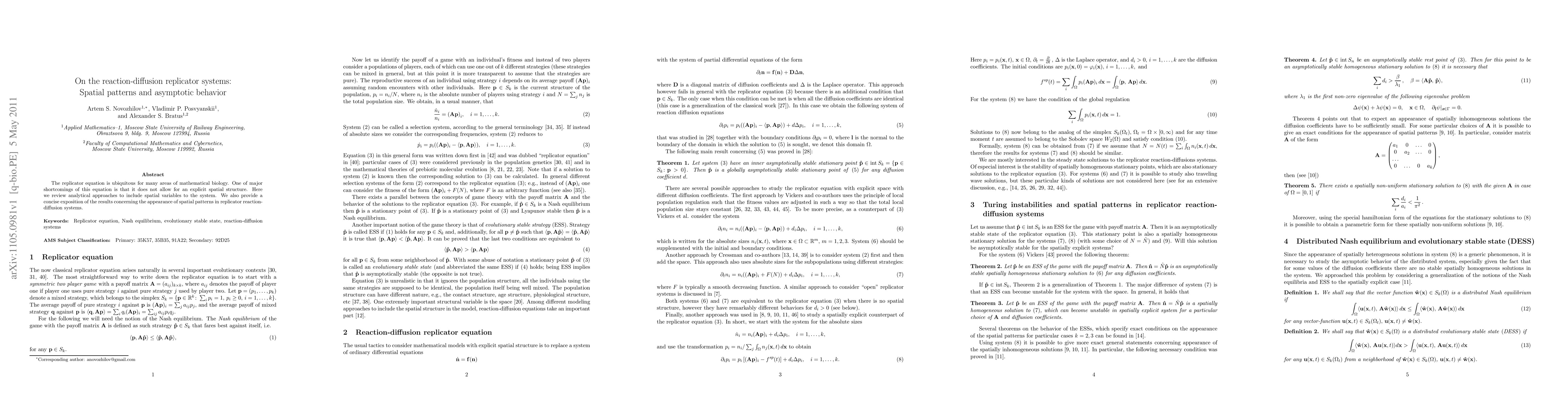 This paper reviews analytical methods to incorporate spatial dynamics into replicator equations, addressing their lack of spatial structure. It summarizes findings on the emergence of spatial patterns in reaction-diffusion replicator systems and their asymptotic behavior.