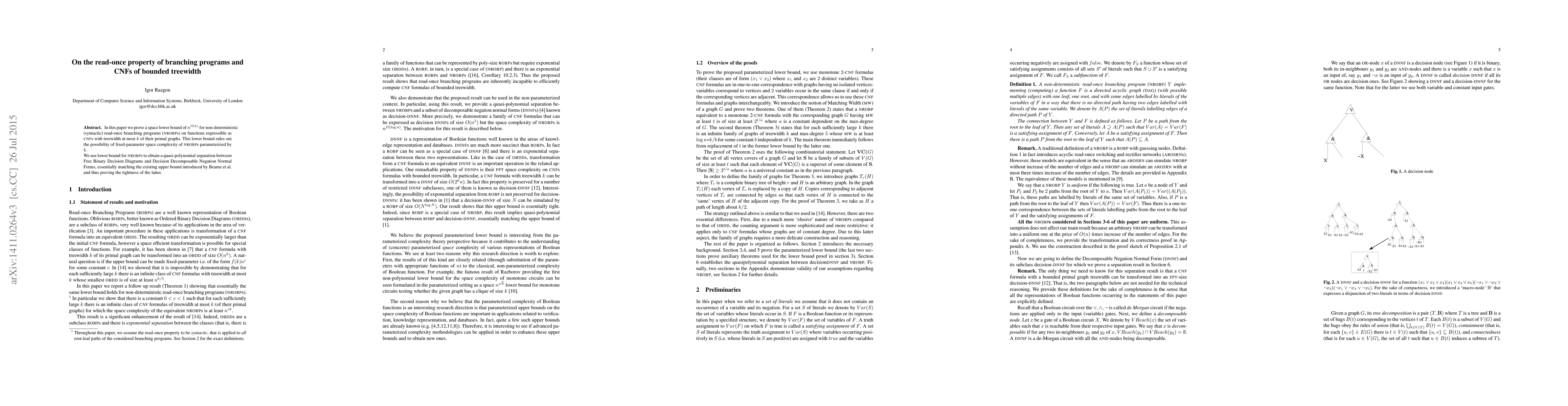 This paper establishes a space lower bound of $n^{\Omega(k)}$ for non-deterministic read-once branching programs on functions represented by CNFs with treewidth at most $k$, ruling out fixed-parameter space complexity. It also demonstrates a quasi-polynomial separation between Free Binary Decision Diagrams and Decision Decomposable Negation Normal Forms, proving the tightness of existing upper bounds.