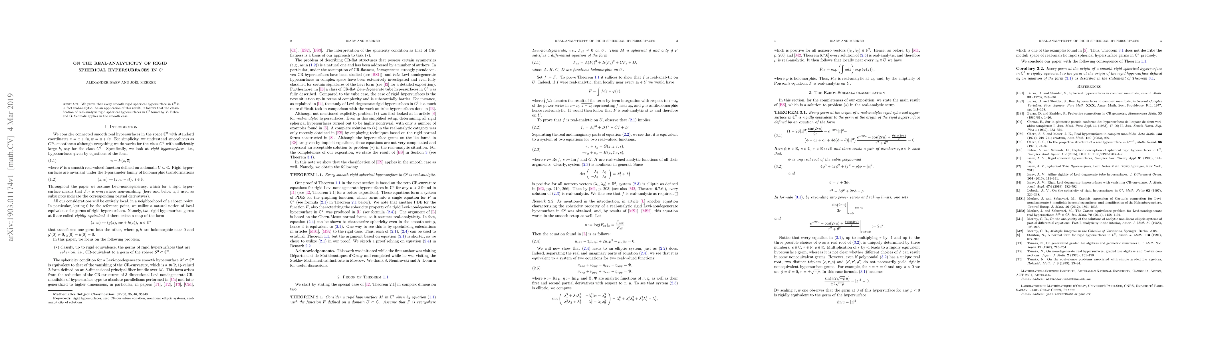 This paper proves that every smooth rigid spherical hypersurface in ${\mathbb C}^2$ is real-analytic. Consequently, the classification of real-analytic rigid spherical hypersurfaces in ${\mathbb C}^2$ by V. Ezhov and G. Schmalz also applies to the smooth case.