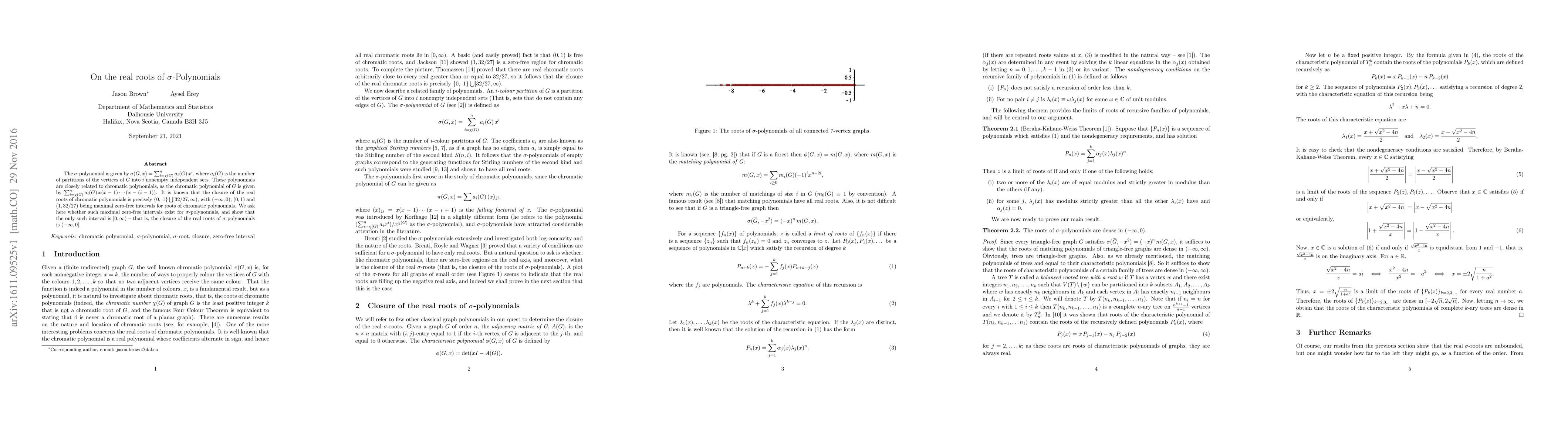The $\sigma$-polynomial is given by $\sigma(G,x) = \sum_{i=\chi(G)}^{n} a_{i}(G)\, x^{i}$, where $a_{i}(G)$ is the number of partitions of the vertices of $G$ into $i$ nonempty independent sets. These polynomials are closely related to chromatic polynomials, as the chromatic polynomial of $G$ is given by $\sum_{i=\chi(G)}^{n} a_{i}(G)\, x(x-1) \cdots (x-(i-1))$. It is known that the closure of the real roots of chromatic polynomials is precisely $\{0,~1\} \bigcup [32/27,\infty)$, with $(-\infty,0)$, $(0,1)$ and $(1,32/27)$ being maximal zero-free intervals for roots of chromatic polynomials. We ask here whether such maximal zero-free intervals exist for $\sigma$-polynomials, and show that the only such interval is $[0,\infty)$ -- that is, the closure of the real roots of $\sigma$-polynomials is $(-\infty,0]$.