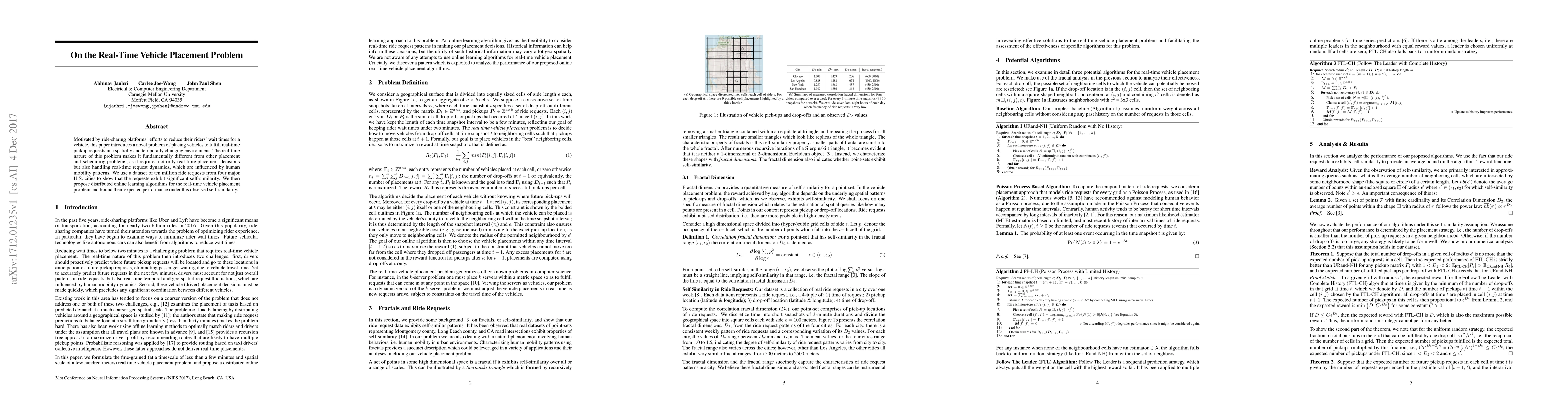 Motivated by ride-sharing platforms' efforts to reduce their riders' wait times for a vehicle, this paper introduces a novel problem of placing vehicles to fulfill real-time pickup requests in a spatially and temporally changing environment. The real-time nature of this problem makes it fundamentally different from other placement and scheduling problems, as it requires not only real-time placement decisions but also handling real-time request dynamics, which are influenced by human mobility patterns. We use a dataset of ten million ride requests from four major U.S. cities to show that the requests exhibit significant self-similarity. We then propose distributed online learning algorithms for the real-time vehicle placement problem and bound their expected performance under this observed self-similarity.