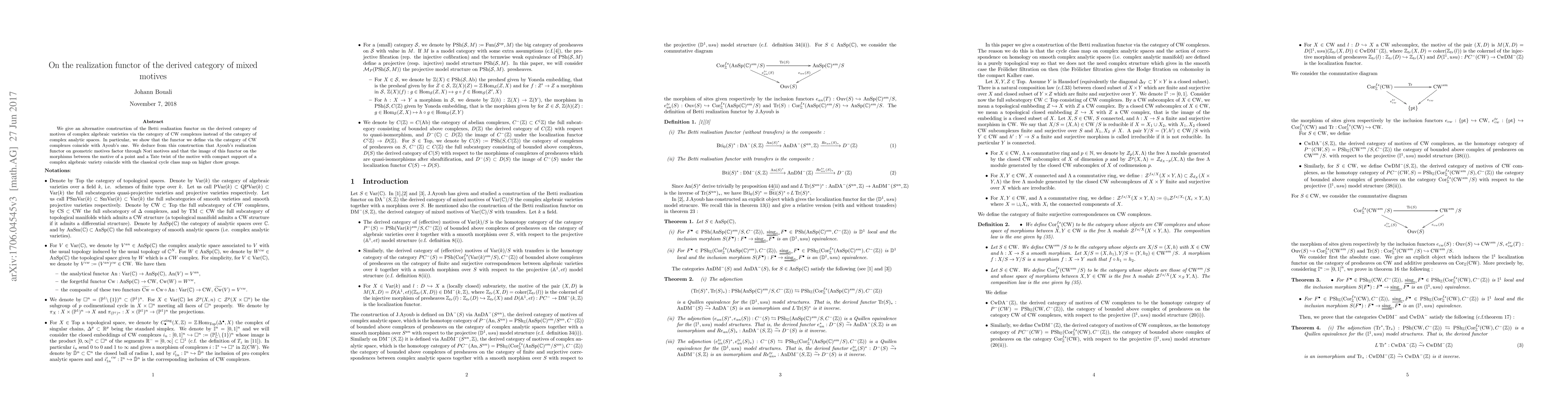 This paper presents an alternative construction of the Betti realization functor for the derived category of mixed motives using the category of CW complexes, demonstrating its equivalence to Ayoub's functor. It concludes that Ayoub's functor on geometric motives factors through Nori motives, and its image aligns with the classical cycle class map on higher Chow groups.