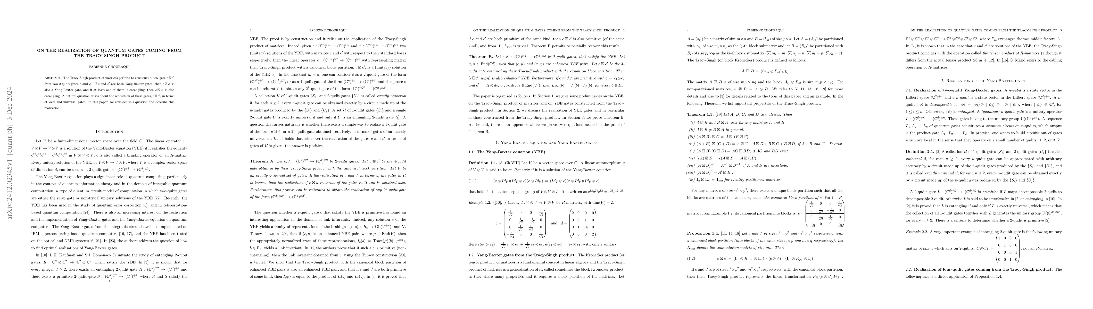 The Tracy-Singh product of matrices permits to construct a new gate $c \boxtimes c'$ from two $2$-qudit gates $c$ and $c'$. If $c$ and $c'$ are both Yang-Baxter gates, then $c \boxtimes c'$ is also a Yang-Baxter gate, and if at least one of them is entangling, then $c \boxtimes c'$ is also entangling. A natural question arises about the realisation of these gates, $c \boxtimes c'$, in terms of local and universal gates. In this paper, we consider this question and describe this realisation.