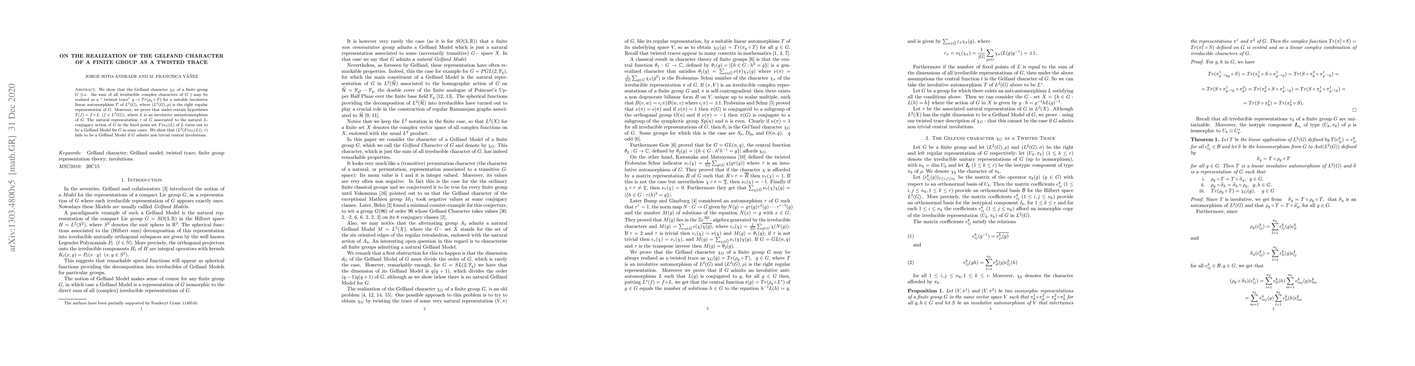 We show that the Gelfand character $ \chi_G$ of a finite group $G $ (i.e. the sum of all irreducible complex characters of $G$ ) may be realized as a `` twisted trace'' $ g \mapsto Tr( \rho_g \circ T) $ for a suitable involutive linear automorphism $T$ of $L^2(G)$, where $(L^2(G), \rho)$ is the right regular representation of $G$. Moreover, we prove that under certain hypotheses $T(f)= f \circ L \;\; (f \in L^2(G)), $ where $ L $ is an involutive antiautomorphism of $ G.$ The natural representation $\tau$ of $G$ associated to the natural $L$-conjugacy action of $G$ in the fixed point set $Fix_G(L)$ of $L$ turns out to be a Gelfand Model for $G$ in some cases. We show that $(L^2(Fix_G(L)), \tau) $ fails to be a Gelfand Model if $G$ admits non trivial central involutions.