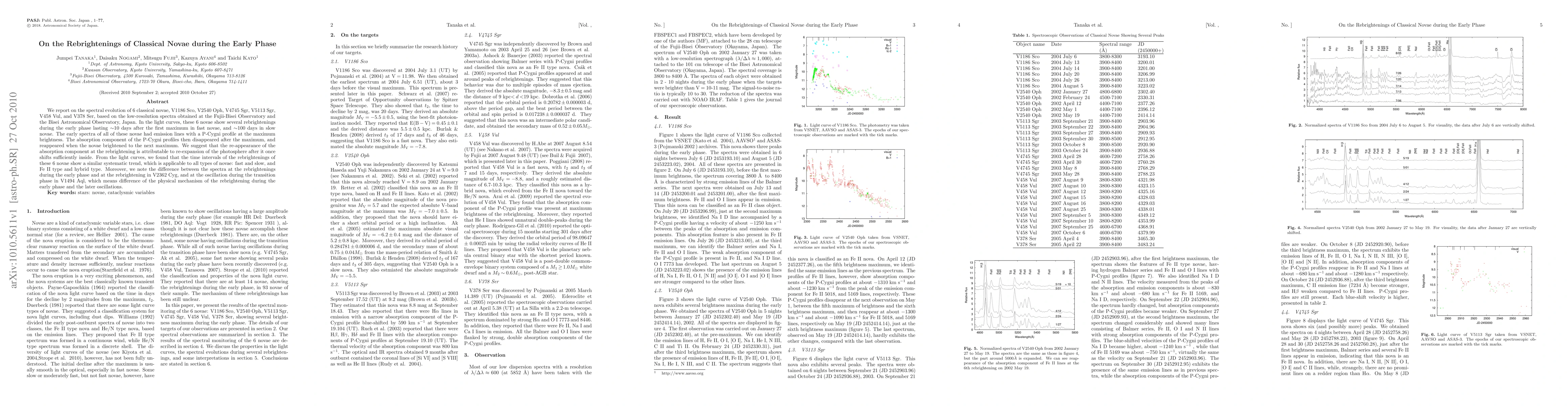 We report on the spectral evolution of 6 classical novae, V1186 Sco, V2540 Oph, V4745 Sgr, V5113 Sgr, V458 Vul, and V378 Ser, based on the low-resolution spectra obtained at the Fujii-Bisei Observatory and the Bisei Astronomical Observatory, Japan. In the light curves, these 6 novae show several rebrightenings during the early phase lasting ~10 days after the first maximum in fast novae, and ~100 days in slow novae. The early spectra of all of these novae had emission lines with a P-Cygni profile at the maximum brightness. The absorption component of the P-Cygni profiles then disappeared after the maximum, and reappeared when the novae brightened to the next maximum. We suggest that the re-appearance of the absorption component at the rebrightening is attributable to re-expansion of the photosphere after it once shifts sufficiently inside. From the light curves, we found that the time intervals of the rebrightenings of these 6 novae show a similar systematic trend, which is applicable to all types of novae: fast and slow, and Fe II type and hybrid type. Moreover, we note the difference between the spectra at the rebrightenings during the early phase and at the rebrightening in V2362 Cyg, and at the oscillation during the transition phase in V1494 Aql, which means difference of the physical mechanism of the rebrightening during the early phase and the later oscillations.