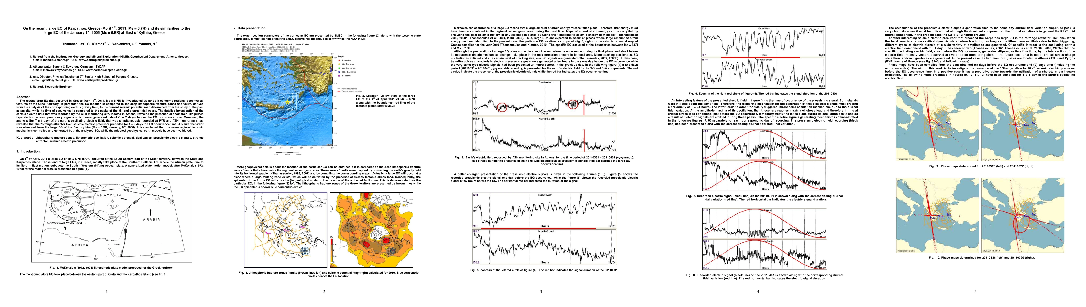 The study investigates the 2011 Karpathos and 2006 Kythira earthquakes in Greece, finding similarities in their regional tectonic mechanisms. Both events preceded by short electric field pulses, indicating potential precursor signals. The research validates geophysical earth models used in analyzing these earthquakes.